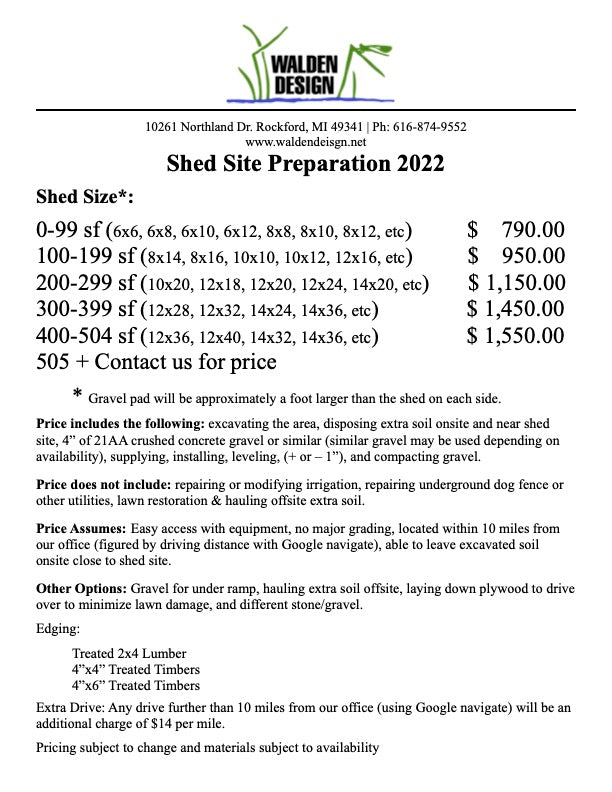 If you need help getting your site prepped for your new buildng Walden Design can help you out. They have done 100's of site preps for our customers over the years and are wonderful to work with! Located In Rockford, MI.