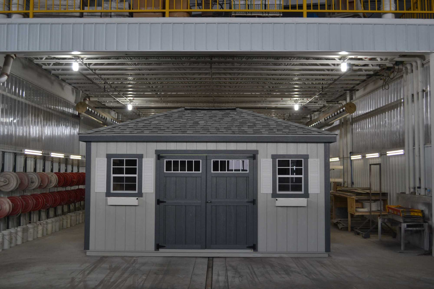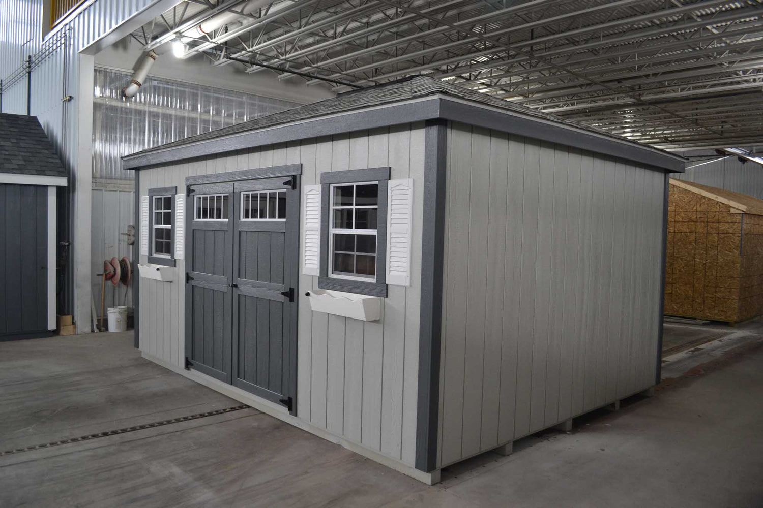 Our Painted Hip Barn Comes Standard With Two Windows (Screens and Shutters Included), A Set Of Double Swinging Doors and 7’4” Sidewalls. The Hip Roof Style Adds Strength Along With A Very Unique Look. Delivered Fully Built With Sizes Ranging From 8x8 Up To 14x40 And Come Standard With 2 Tone Painted Siding & 25 Year IKO Three Tab Shingles. These Amish Built Portable Storage Buildings Are Available For Sale Or Rent To Own