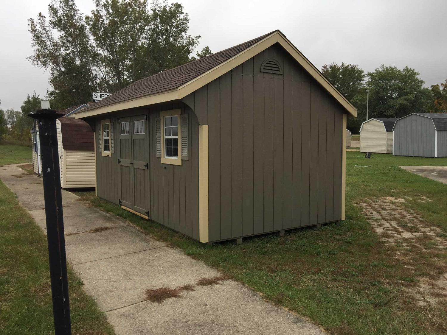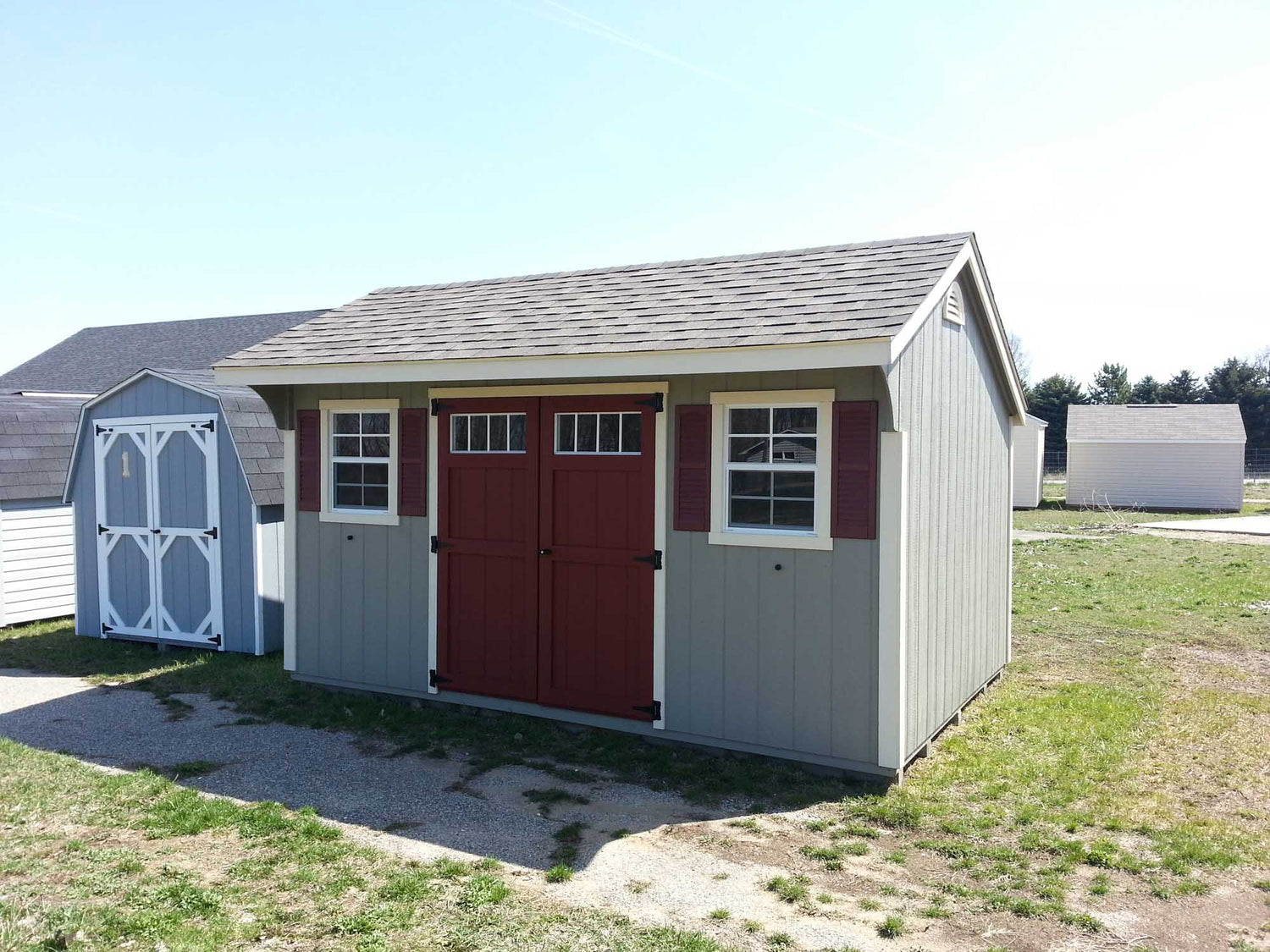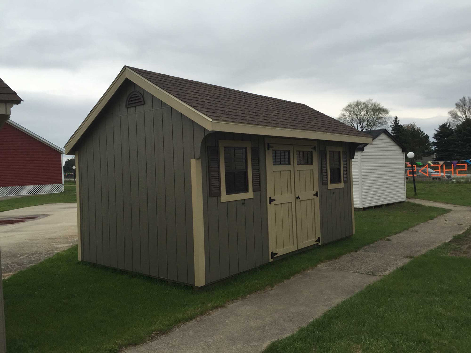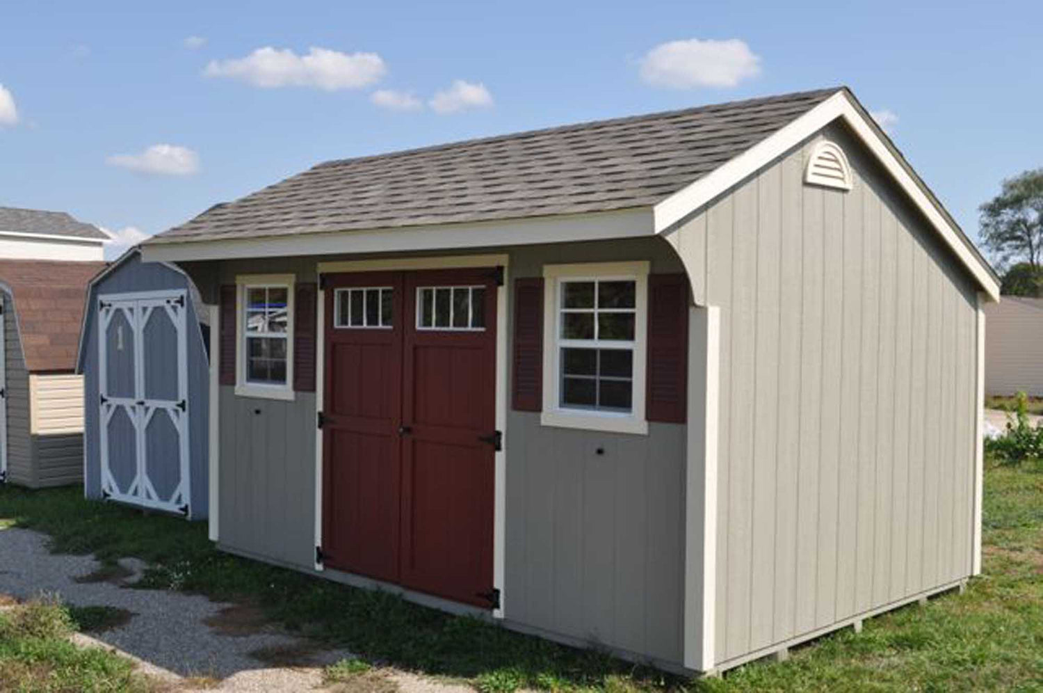 Our Painted Carriage Adds A Very Unique Look To Your Property. The Carriage House Storage Shed Is Available From 6x8 up to 12x36 And Comes Standard With Two Tone Painted T1-11 Siding (Your Choice Of Colors). These Storage Buildings Have a 7’ Front Wall and a 6’ Back Wall And Come Standard With Wood Double Swing Doors and Two Windows With Screens and Shutters (note: 6x8 – 8x10 Only Come With One Window).