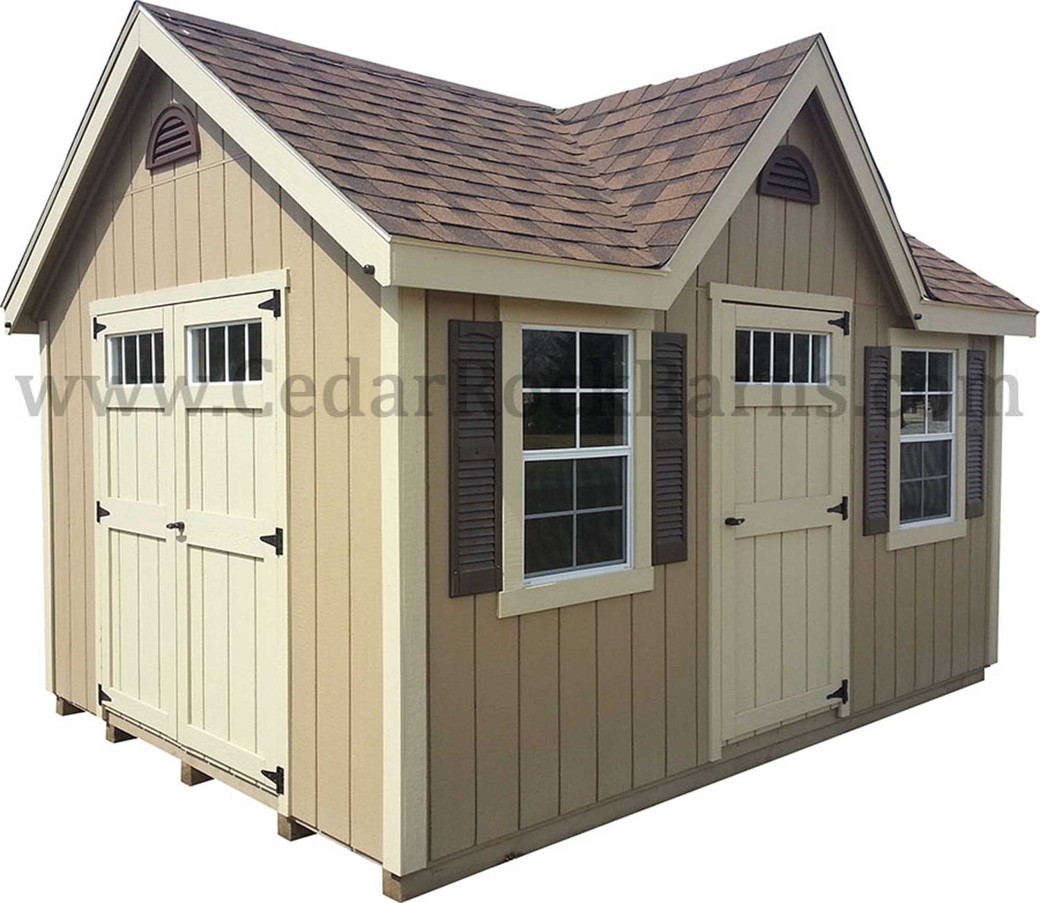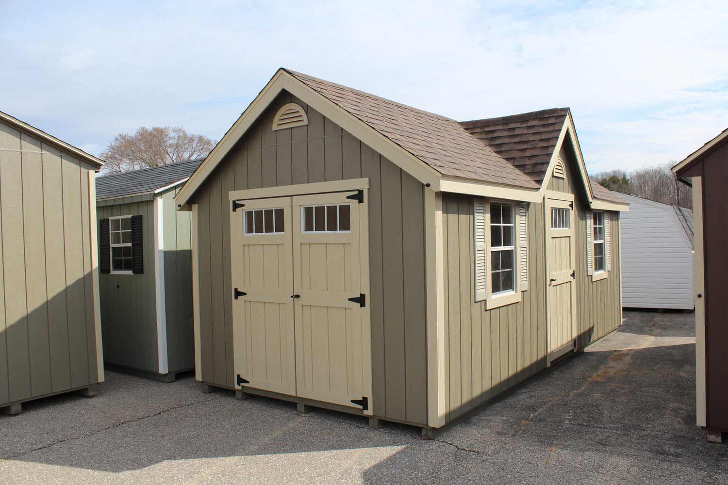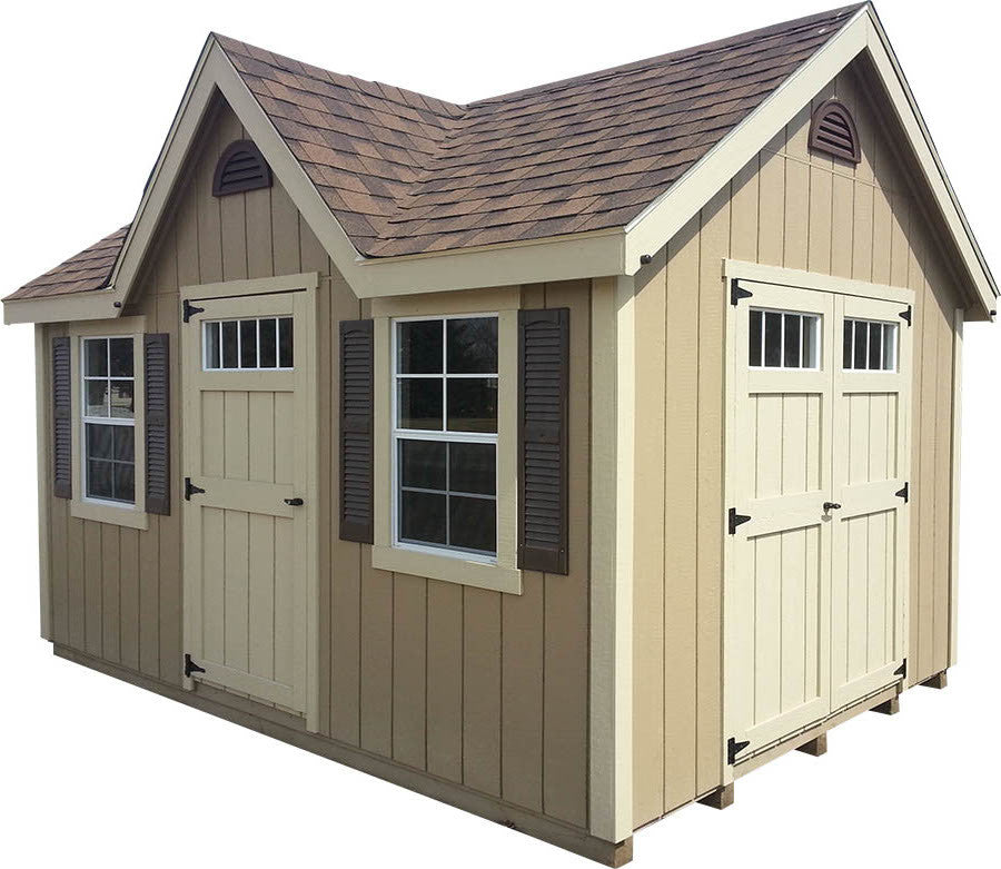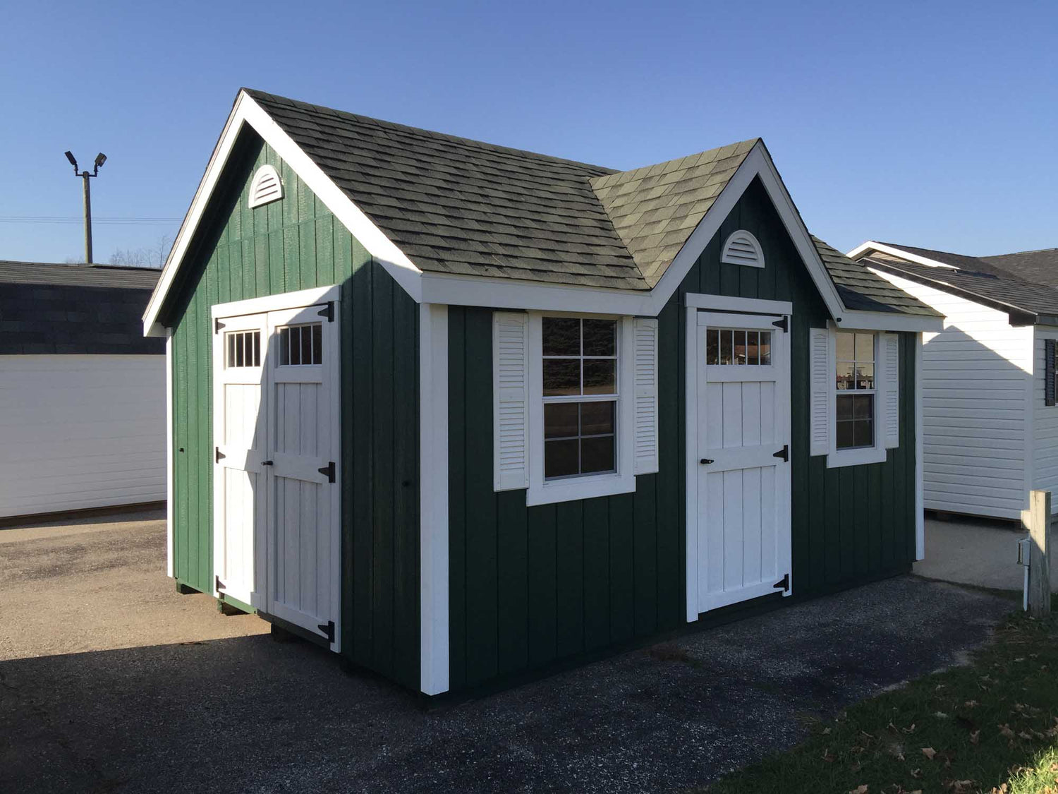 If You Are Looking For A Custom Look With Out The “Custom Look Prices” Look No Further. Our Amish Built Painted Chalet Portable Buildings Are Built With High Quality 2x4 Framing, Exterior Grade Plywood On Top Of Treated 2x4 Floor Joists Which Are Laid On Edge 12” O.C. and 4x4 Treated Runners. These Buildings Will Add A Wow Factor To Your Backyard Or Garden. These Storage Buildings Come Standard With A Front Dormer, 32” Entrance Door, Two Windows W/ Screens And Shutters, 6’ Double Wood Swinging Doors and 6’4” Sidewalls With Two Tone Paint And Your Choice Of Colors.