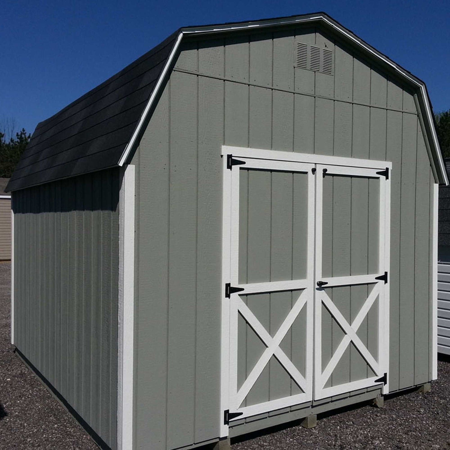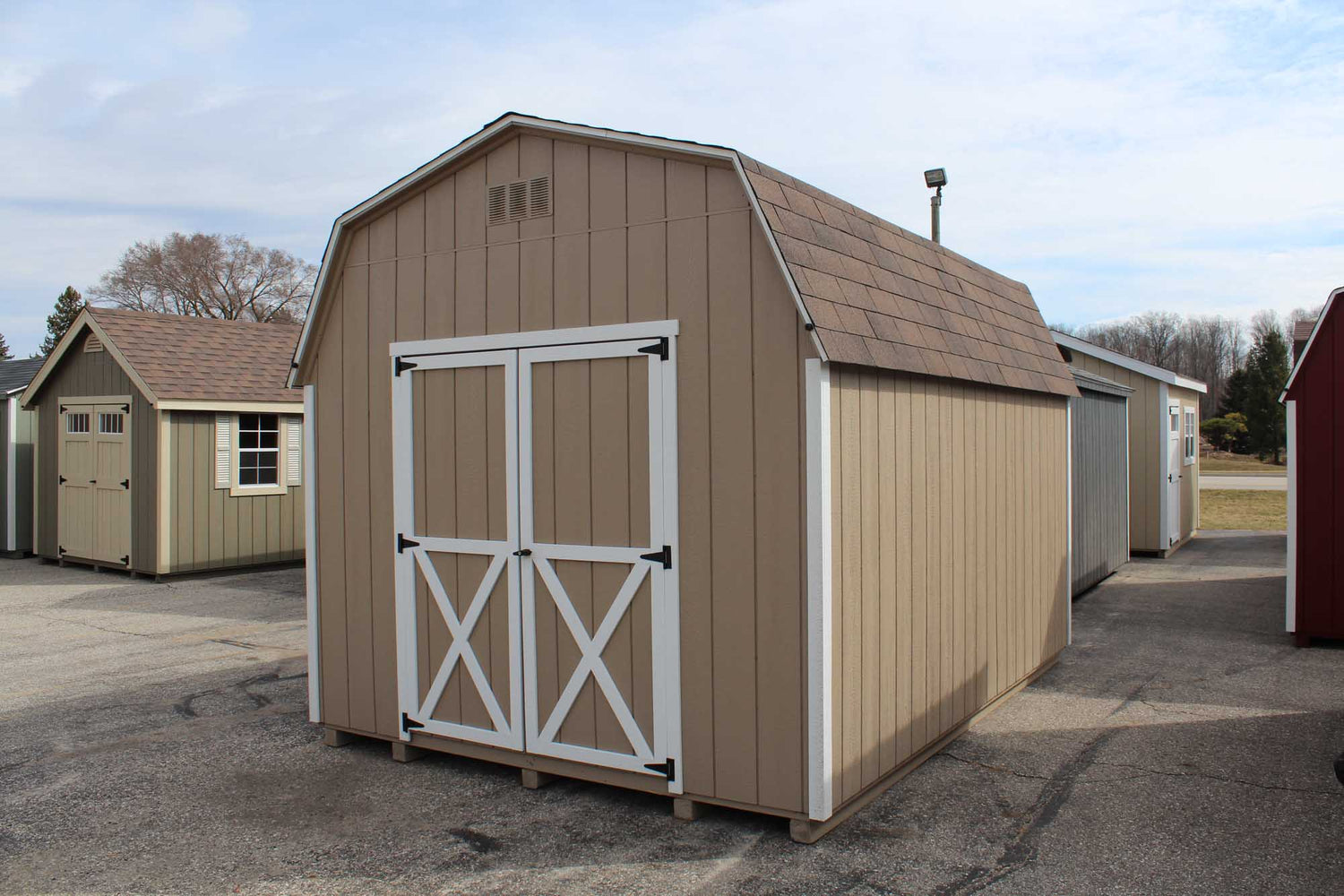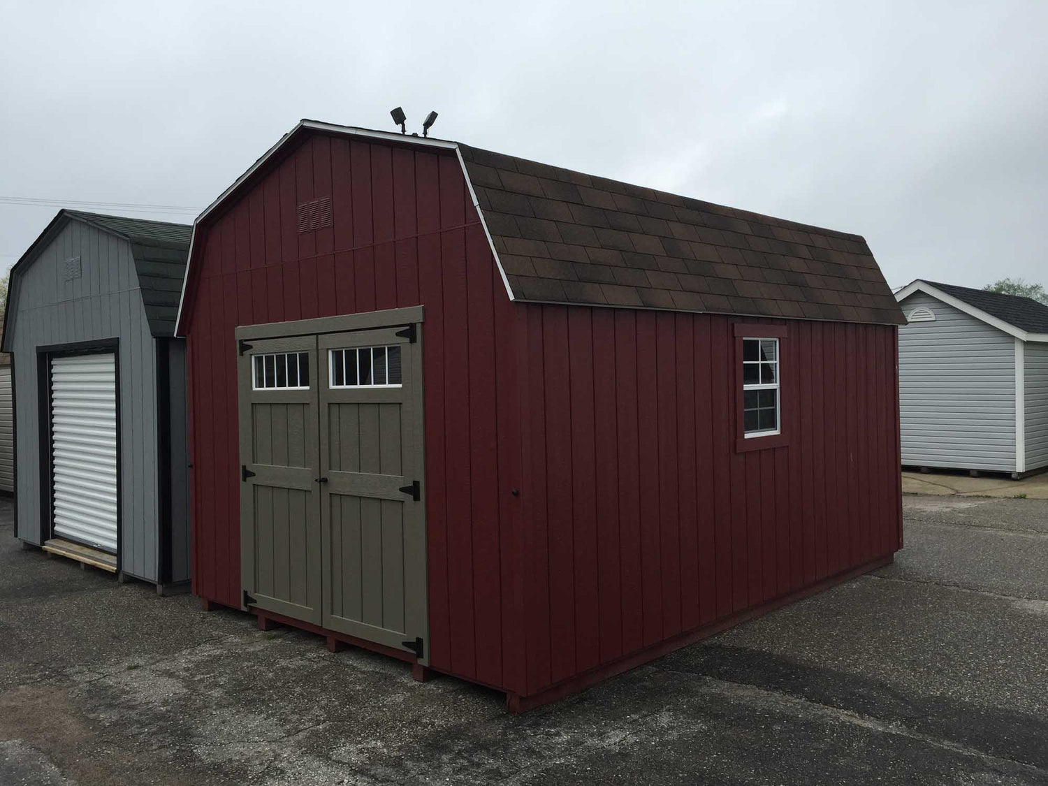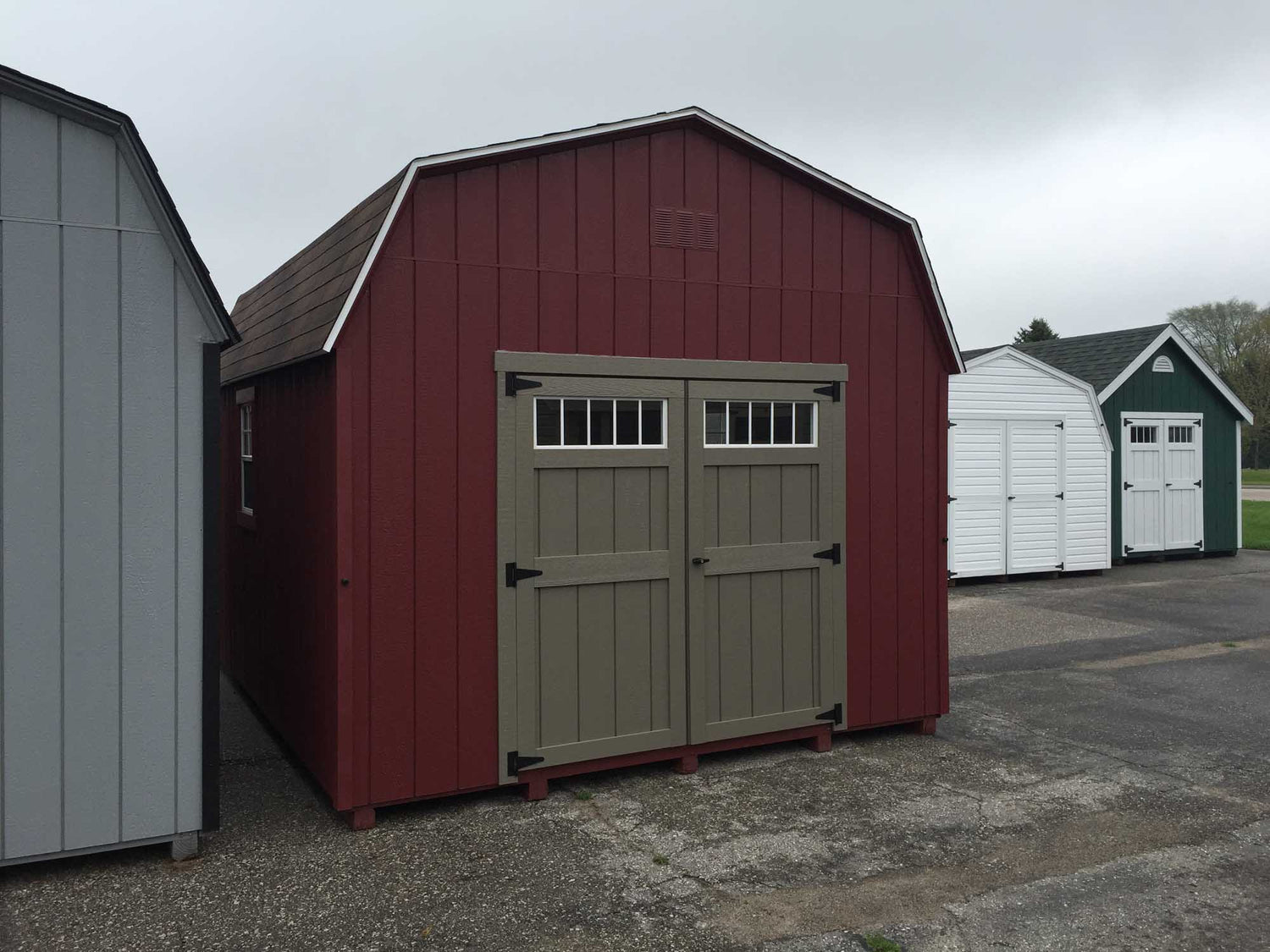Our Painted High Barn Storage Building Built By Mast Mini Barns Offers The Advantage Of Having A Gambrel Roof To Allow Maximum Storage Space. This Building Comes Standard With 5x6 Double Swinging Doors, 6’ Sidewalls and Stands At 10’Tall.