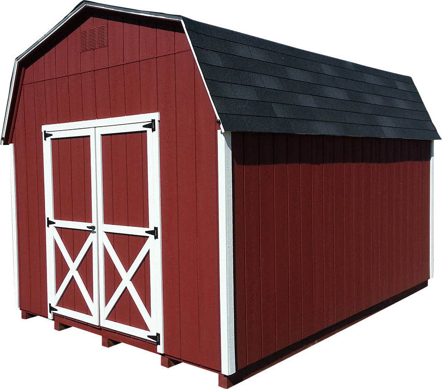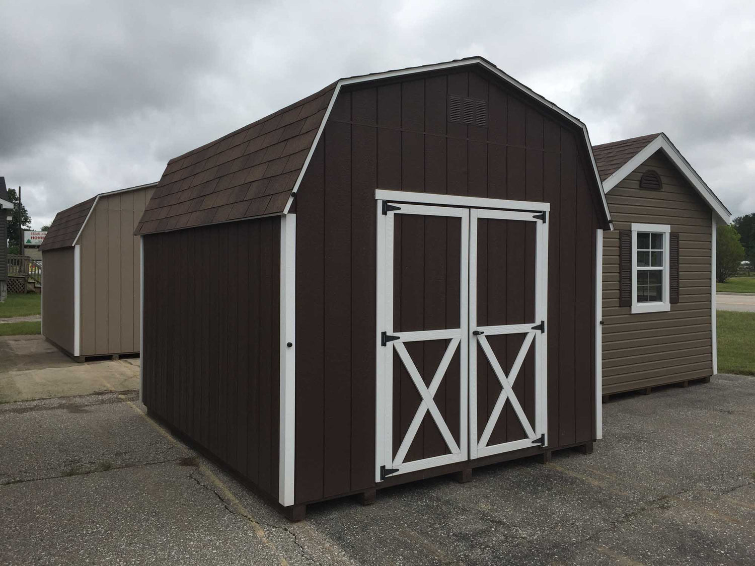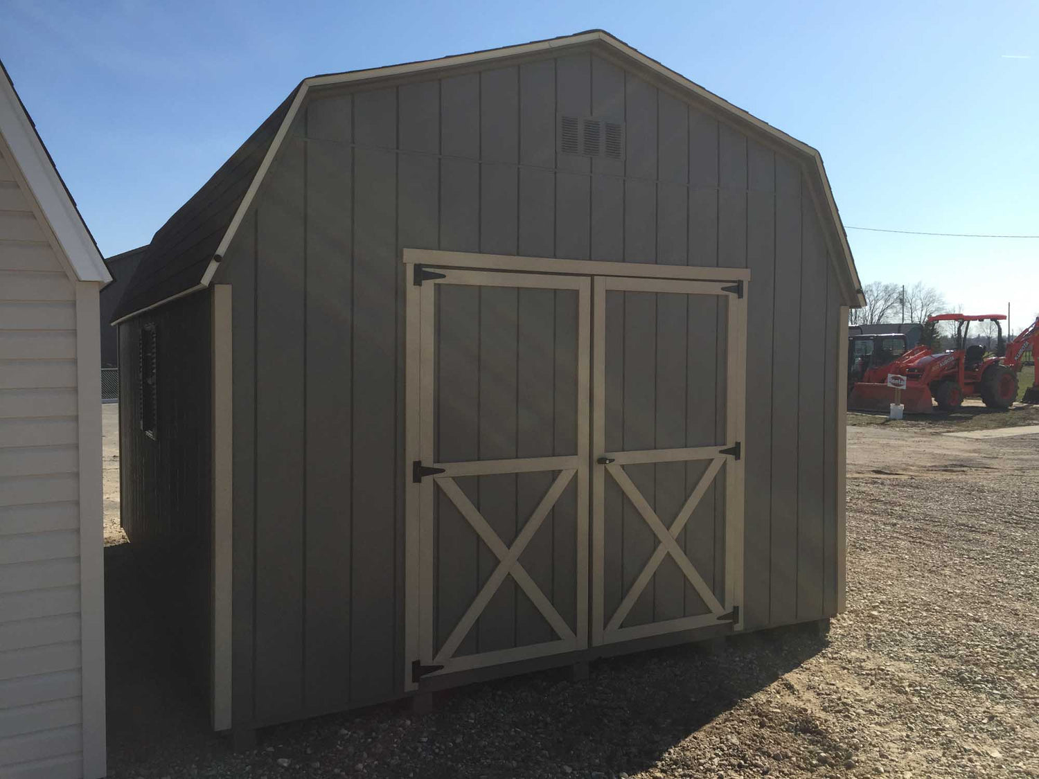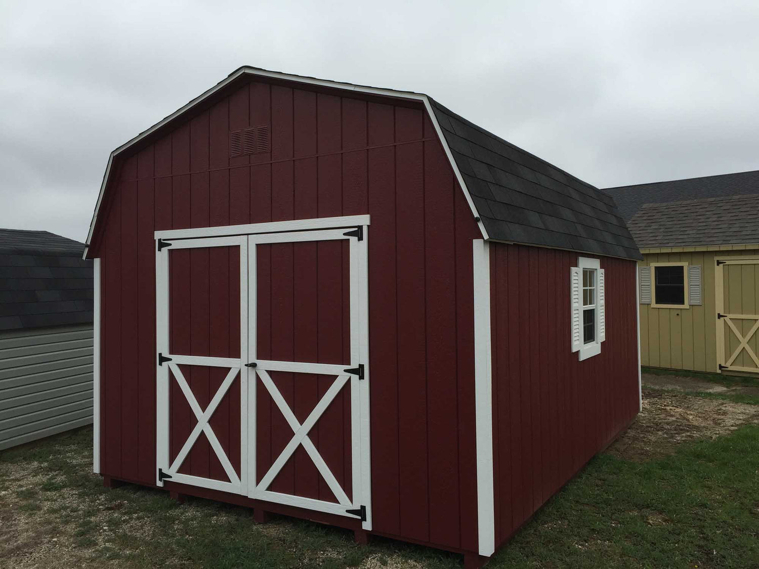 Our Painted High Barn Storage Building Built By Mast Mini Barns Offers The Advantage Of Having A Gambrel Roof To Allow Maximum Storage Space. This Building Comes Standard With 5x6 Double Swinging Doors, 6’ Sidewalls and Stands At 10’Tall.