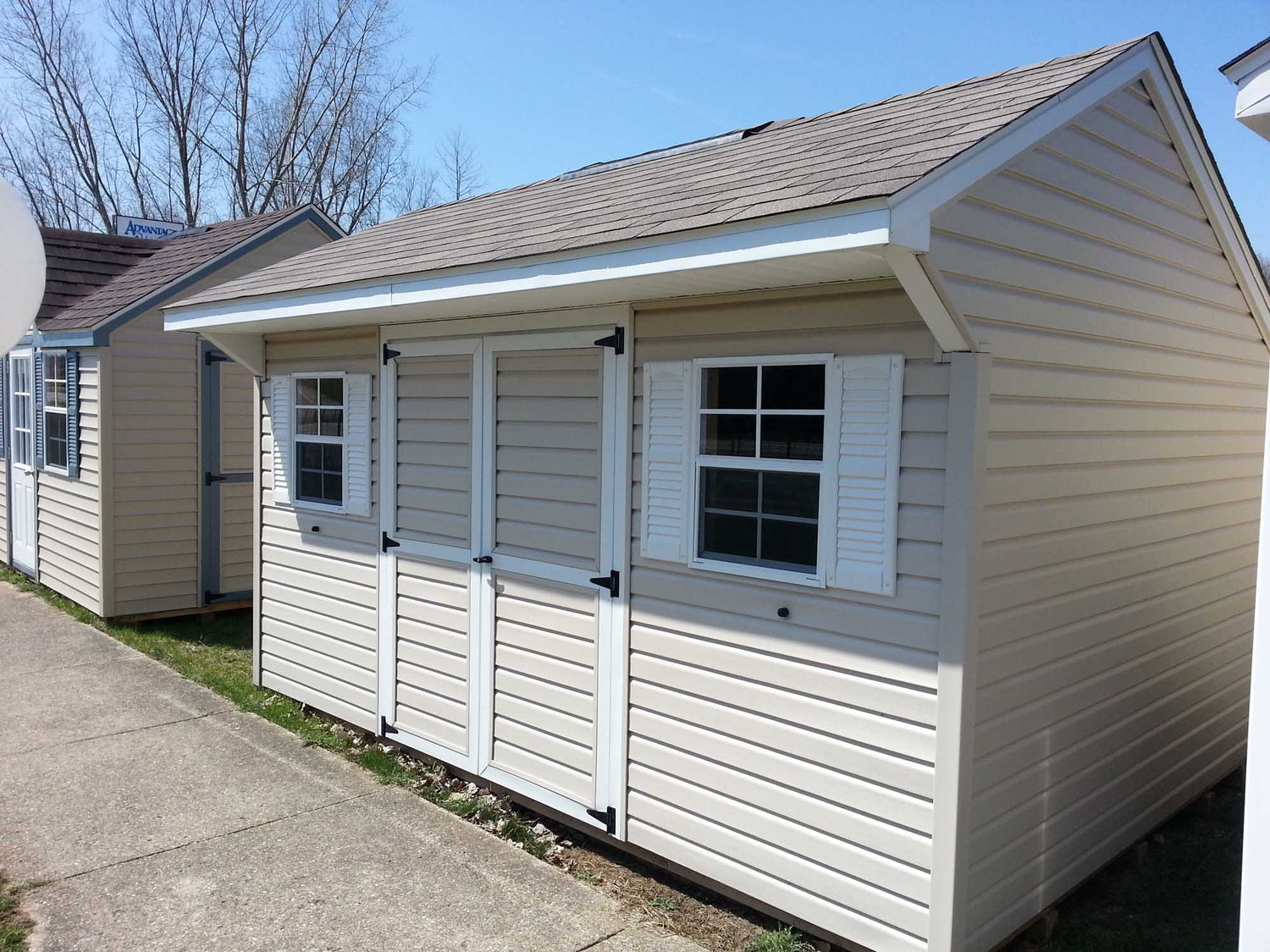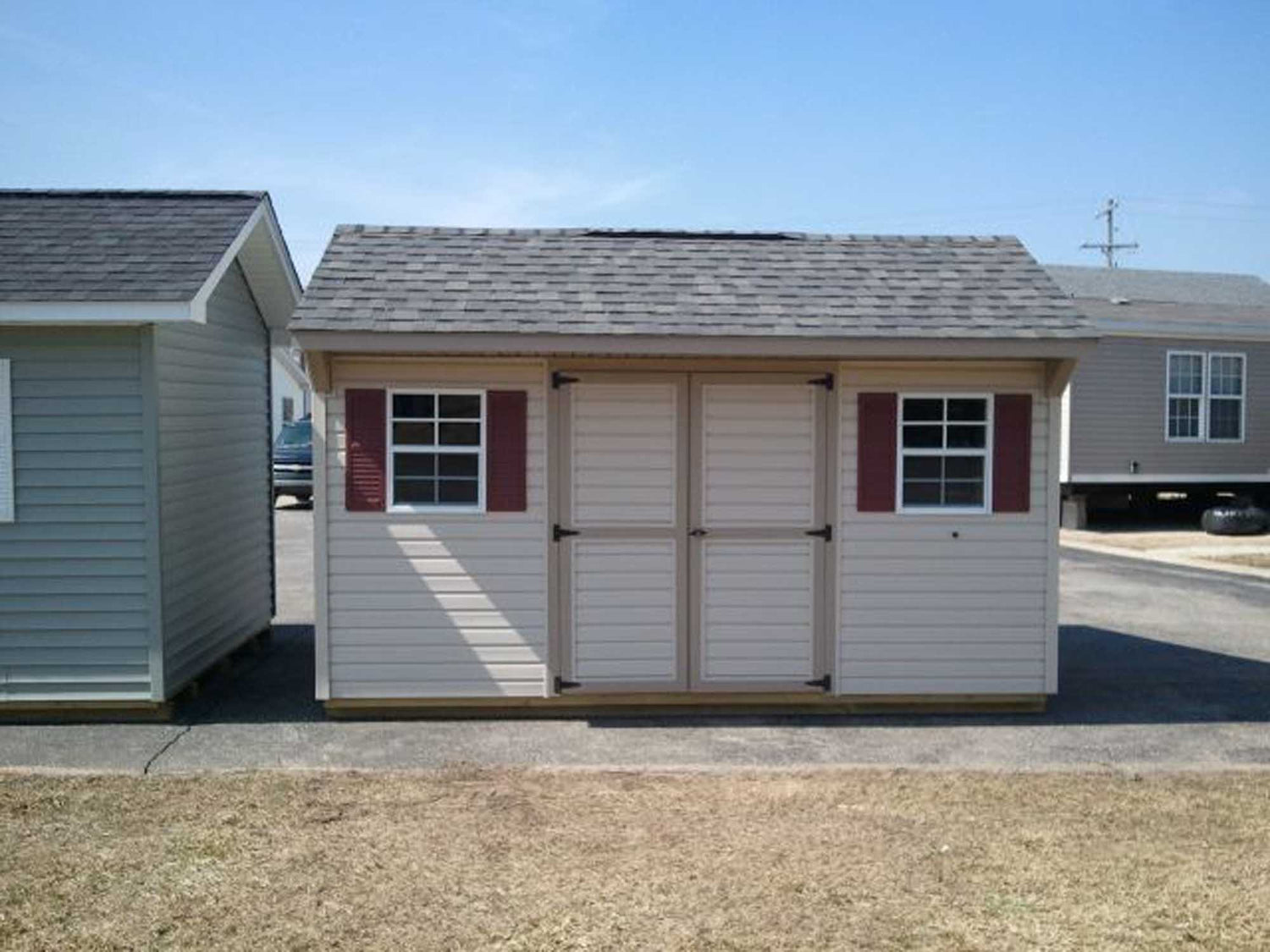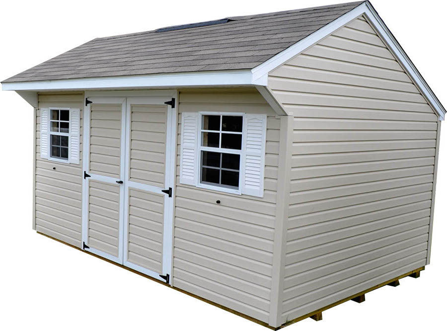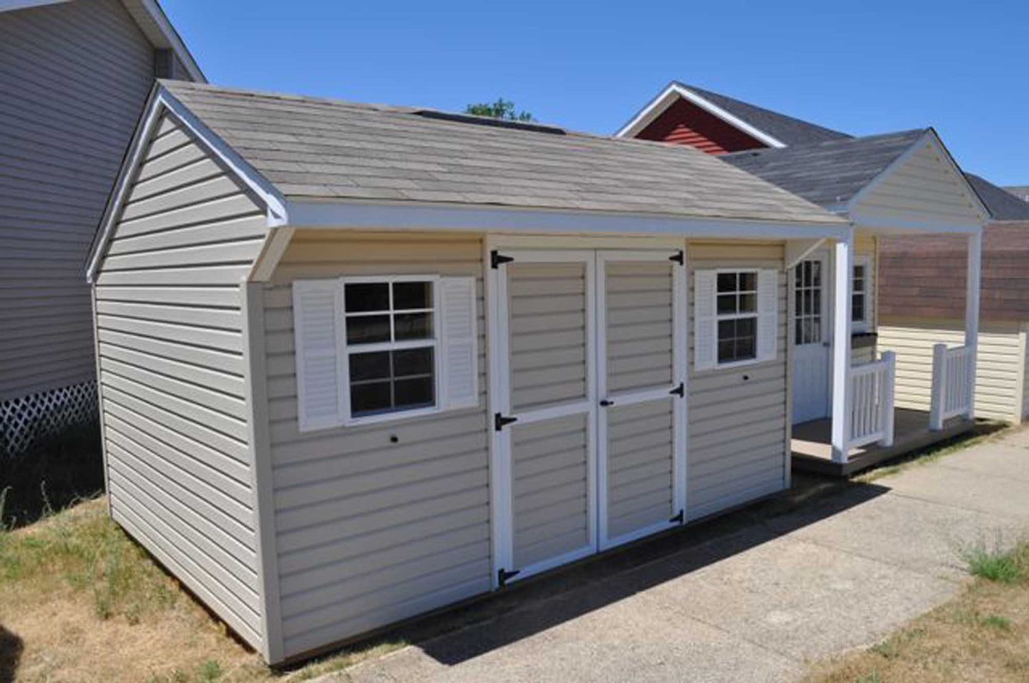 With 7’ Front Walls and 6’ Back Walls The Look Of Our Vinyl Carriage House Storage Sheds Is Outstanding. These Vinyl Sided Portable Sheds Are Amish Built With Quality 2x4 Framing And Are Made To Last. Two Windows With Screens & Shutters along With A Set Of Vinyl Double Swing Doors Come Standard With This Shed (6x8 – 8x10 Only One Window). Sizes Range From 6x8 And Go As Large As 12x36.