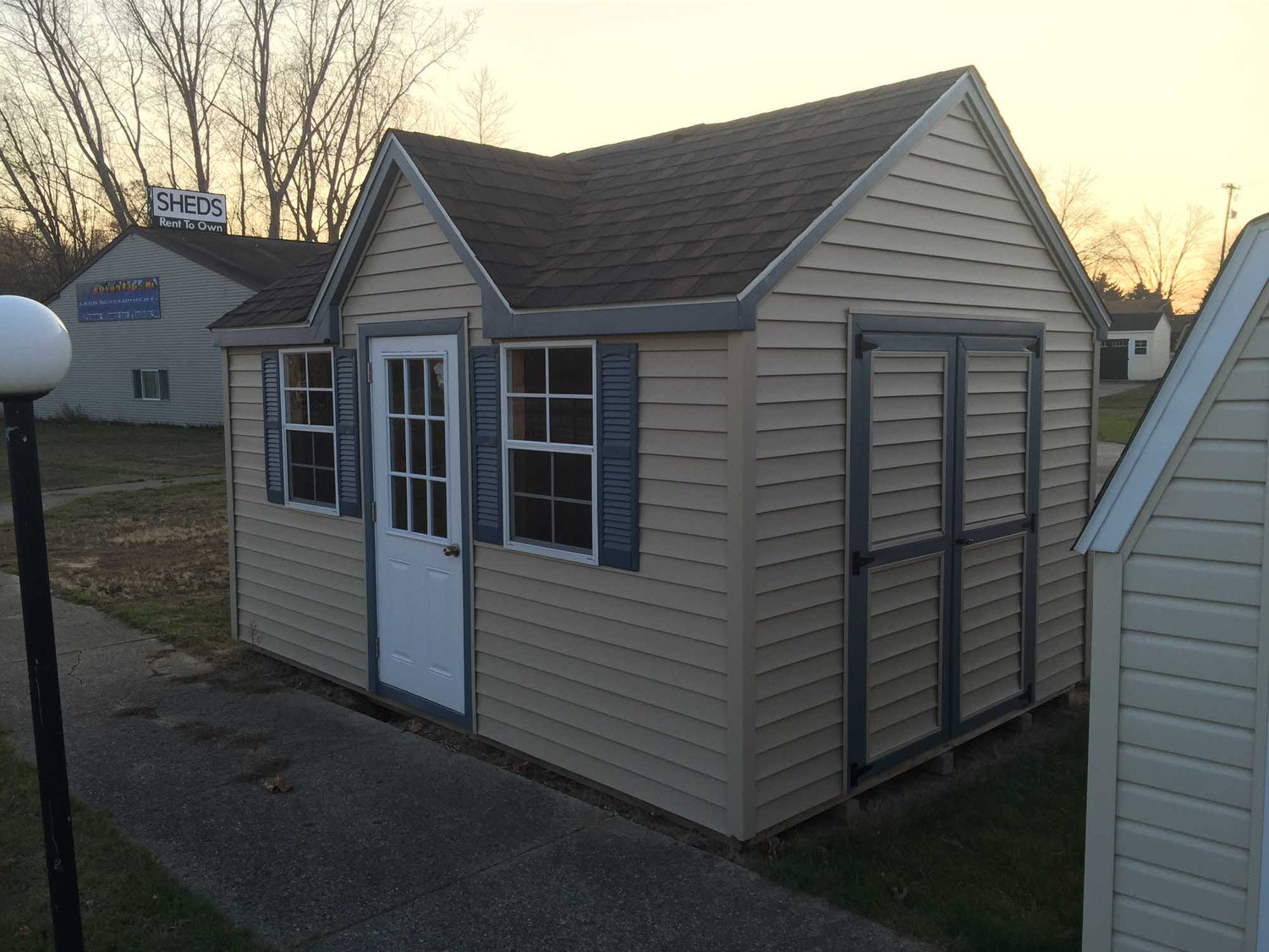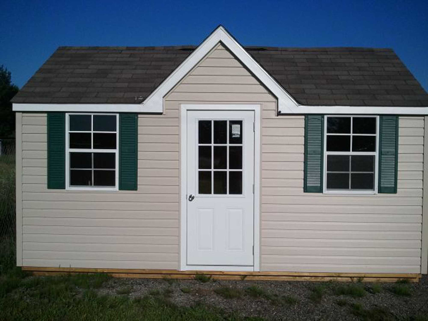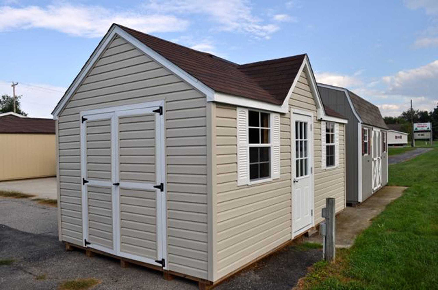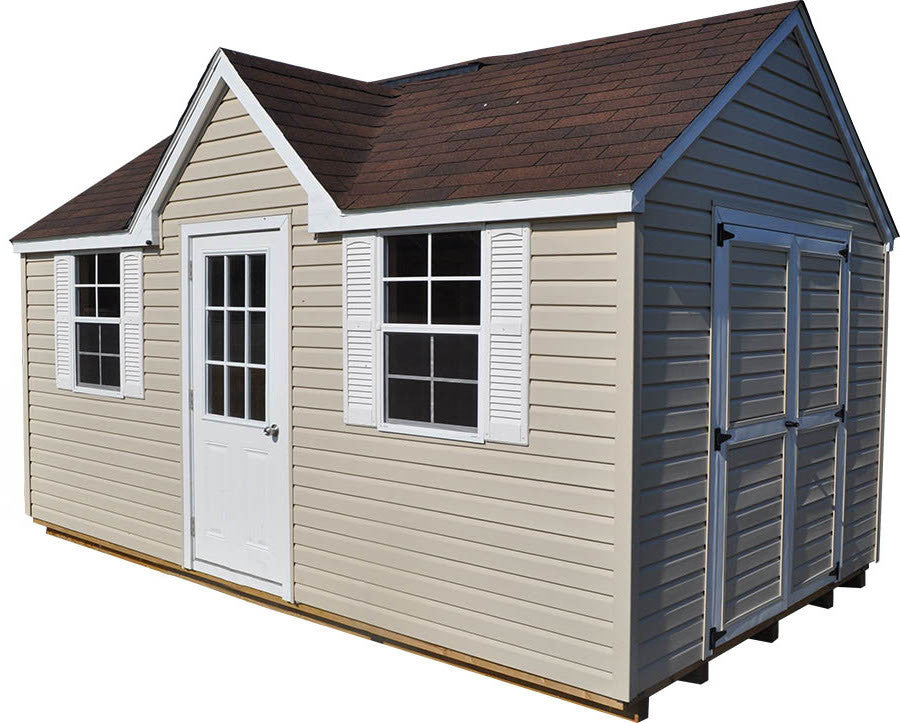 With a Standard Front Dormer, 32” Entrance Door, And Two Windows With Screens And Shutters, The Vinyl Chalet Portable Sheds Offer A Original Look To The Classic Outside Storage Building. A Set Of Vinyl Swinging Double Doors Are Also Standard In Order To Fit Larger Items Into The Building. Lifetime Vinyl Siding On This Shed Offers A Maintenance Free Solution To Your Garden Storage Needs. Available In Sizes From 8x12 Up To 12x36.