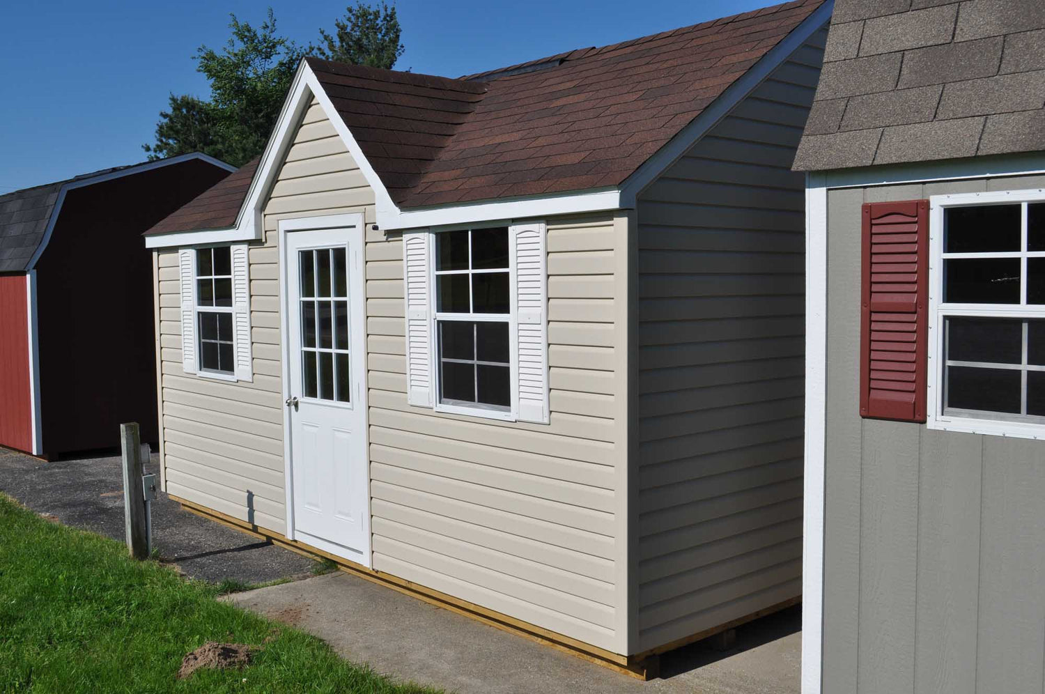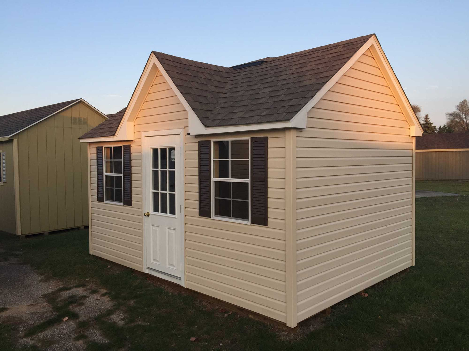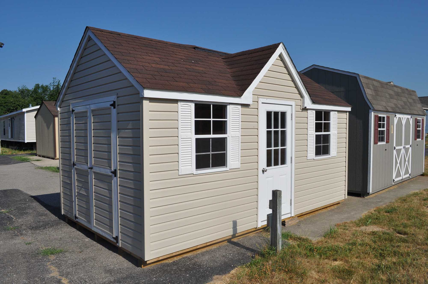 With a Standard Front Dormer, 32” Entrance Door, And Two Windows With Screens And Shutters, The Vinyl Chalet Portable Sheds Offer A Original Look To The Classic Outside Storage Building. A Set Of Vinyl Swinging Double Doors Are Also Standard In Order To Fit Larger Items Into The Building. Lifetime Vinyl Siding On This Shed Offers A Maintenance Free Solution To Your Garden Storage Needs. Available In Sizes From 8x12 Up To 12x36.