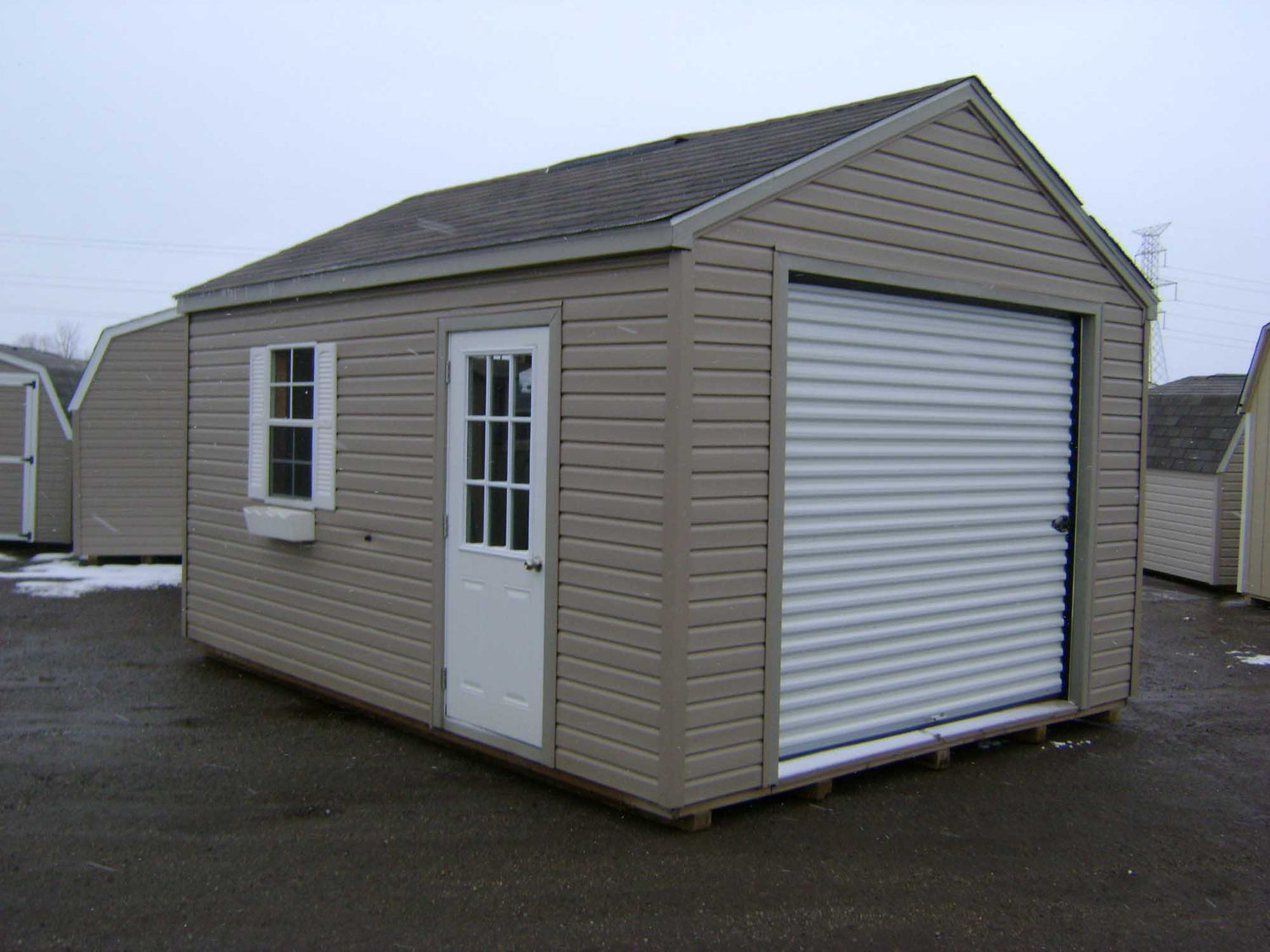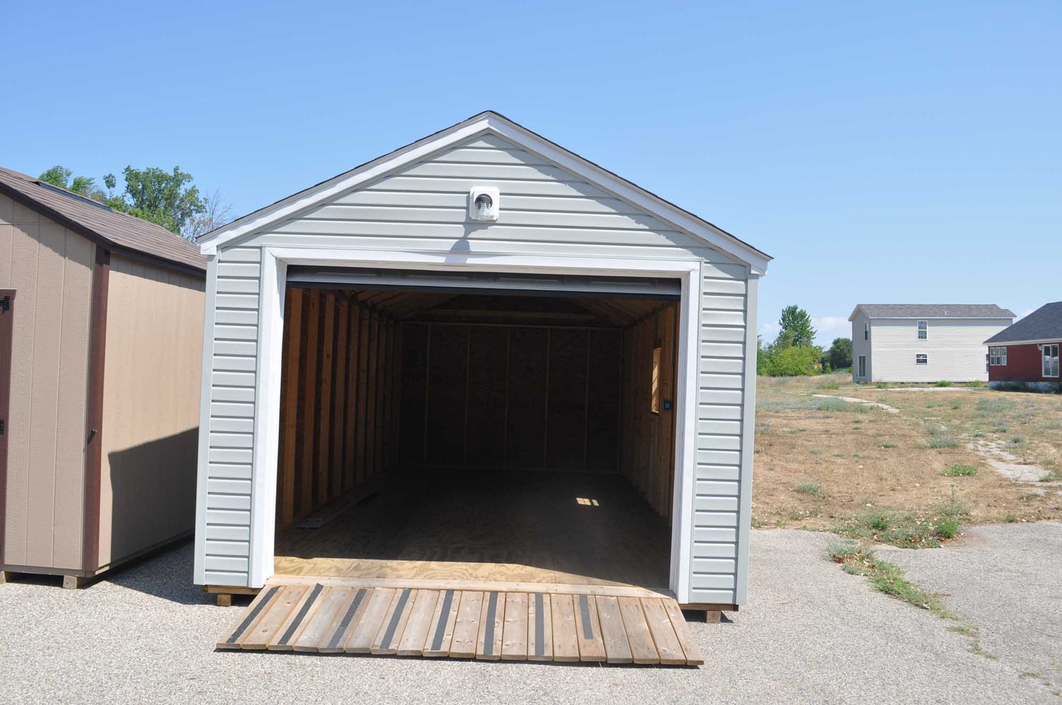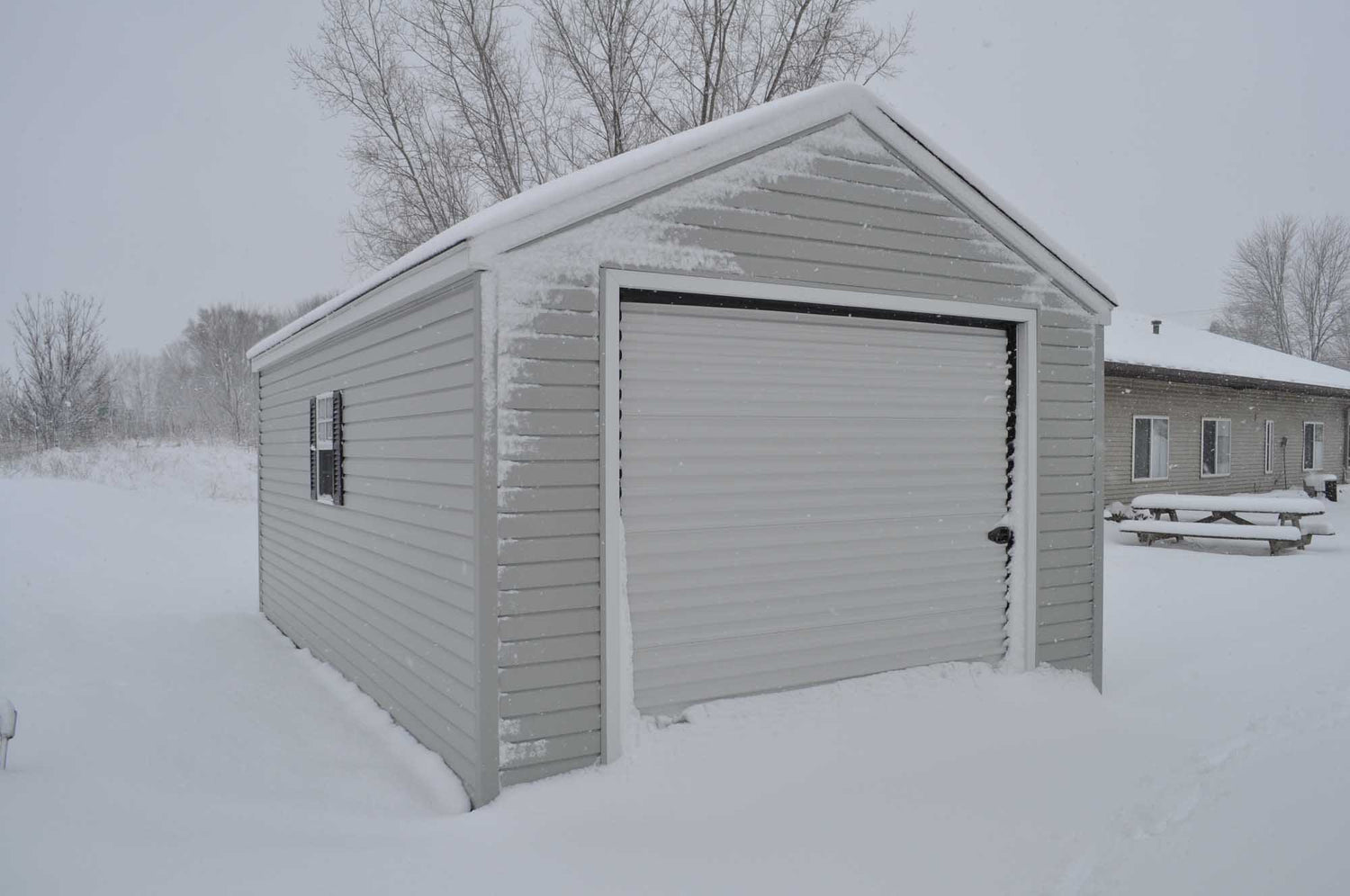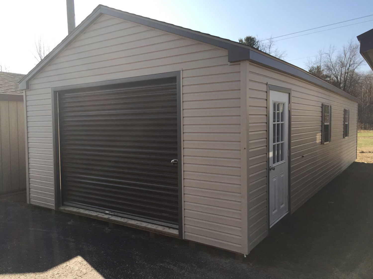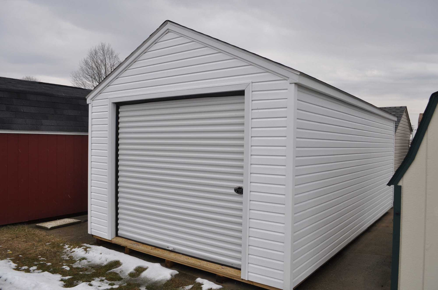 The Vinyl Garage Storage Building Comes Standard With An 8’ Steel TracRite Roll Up Door, 7’ 4” Sidewalls and 3/4" Treated Floors In Order To Hold A Vehicle Or Heavy Equipment. Larger Doors And Sectional Overhead Garage Doors Are Also Available On The Garage Storage Buildings. This Building Also Comes With Maintenance Free Lifetime Vinyl Siding (Your Choice Of Colors), And 3 Tab IKO 25 Year Shingles. These Portable Storage Buildings Are Delivered Fully Built And Available In Sizes Ranging From 12x16 And Up To 16x48.