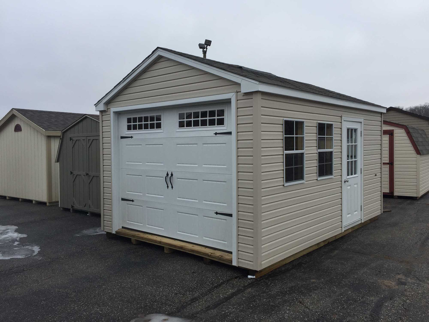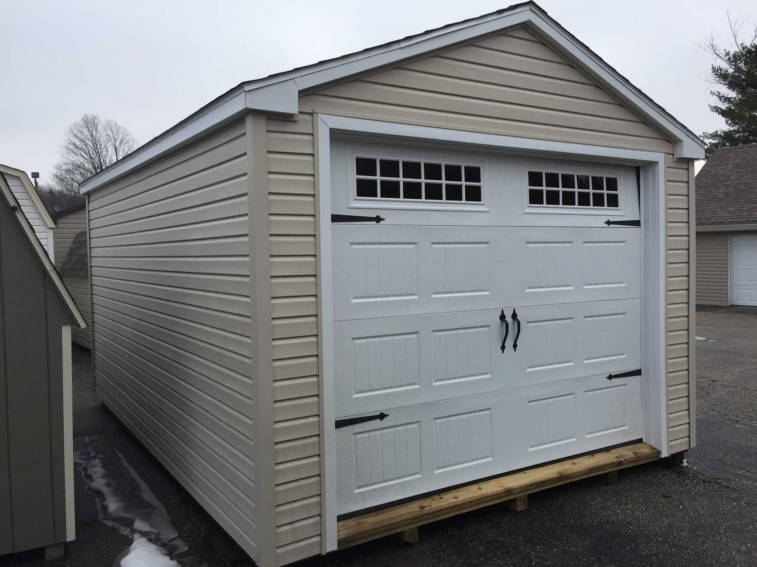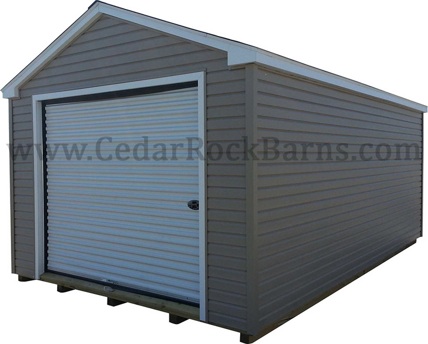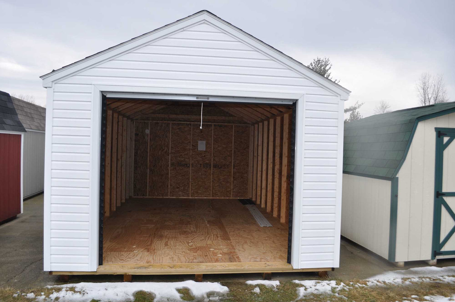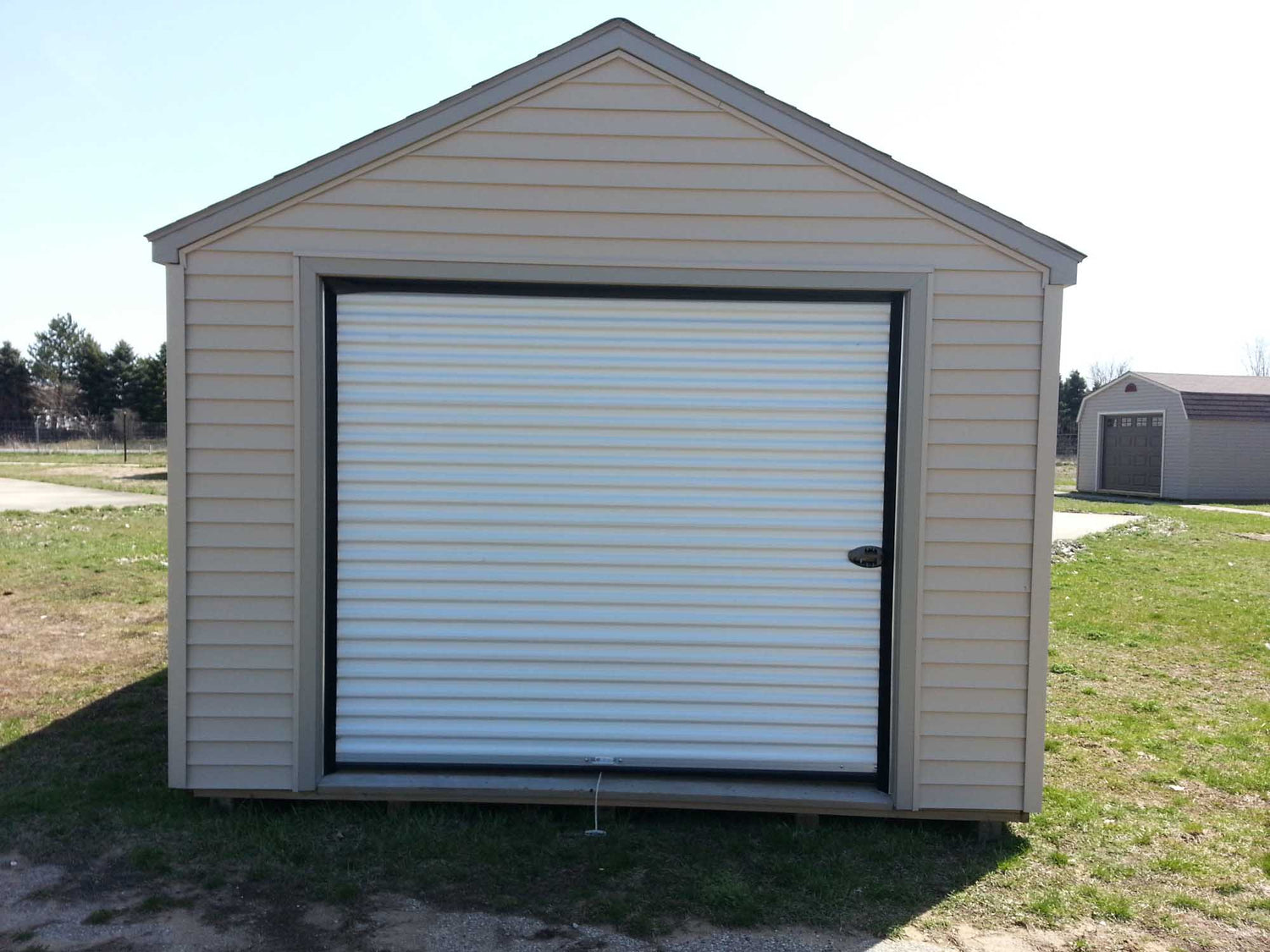 The Vinyl Garage Storage Building Comes Standard With An 8’ Steel TracRite Roll Up Door, 7’ 4” Sidewalls and 3/4" Treated Floors In Order To Hold A Vehicle Or Heavy Equipment. Larger Doors And Sectional Overhead Garage Doors Are Also Available On The Garage Storage Buildings. This Building Also Comes With Maintenance Free Lifetime Vinyl Siding (Your Choice Of Colors), And 3 Tab IKO 25 Year Shingles. These Portable Storage Buildings Are Delivered Fully Built And Available In Sizes Ranging From 12x16 And Up To 16x48.