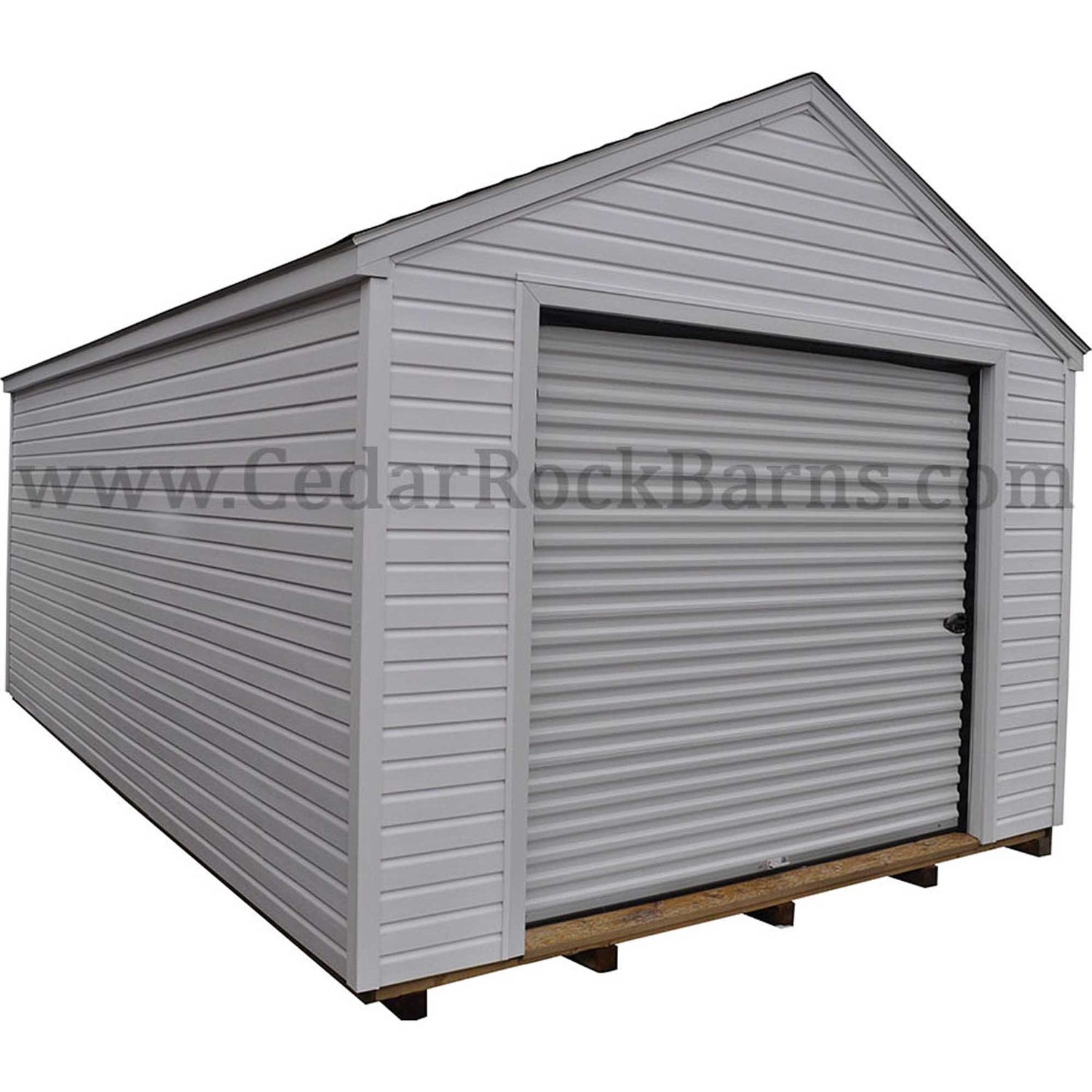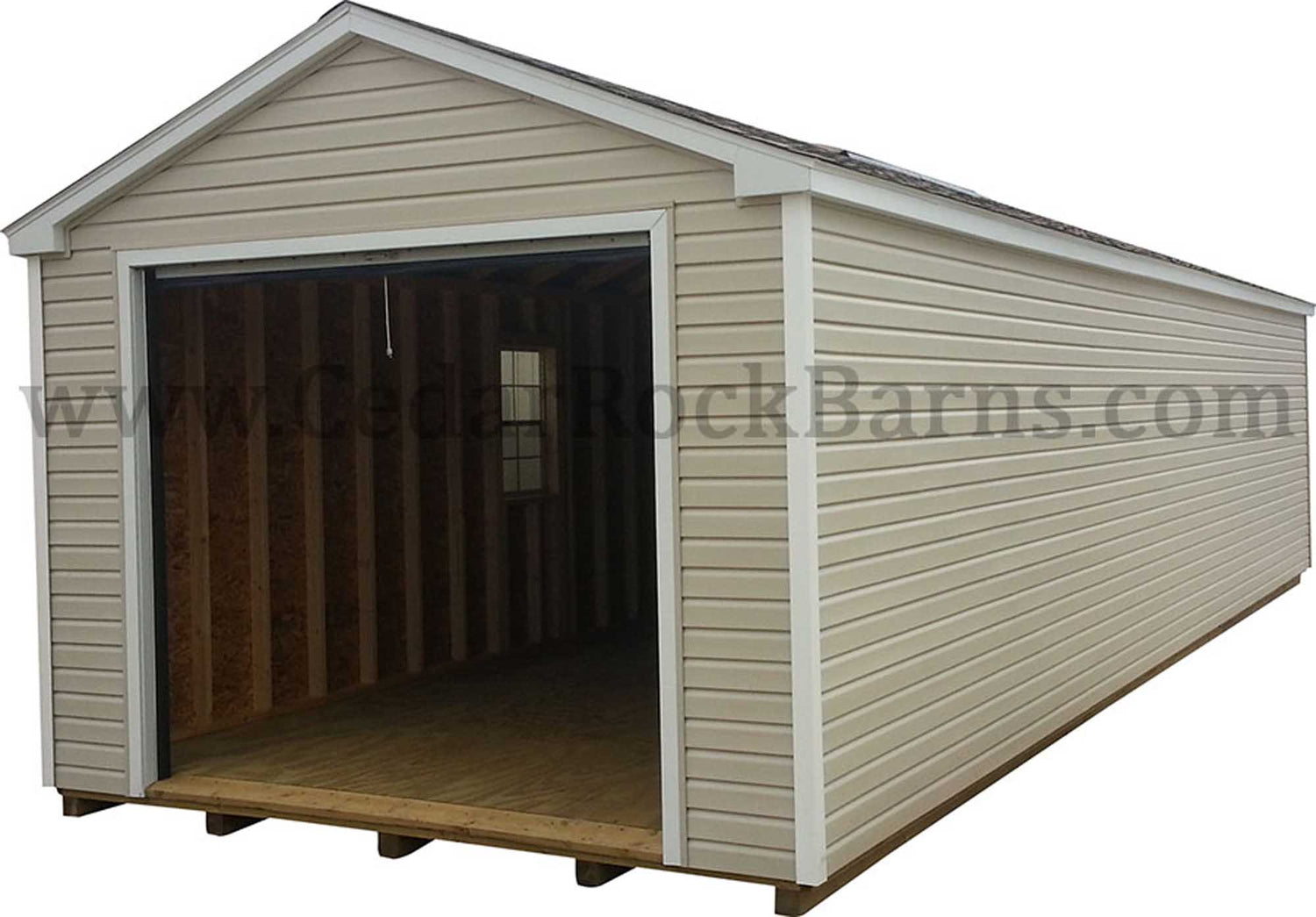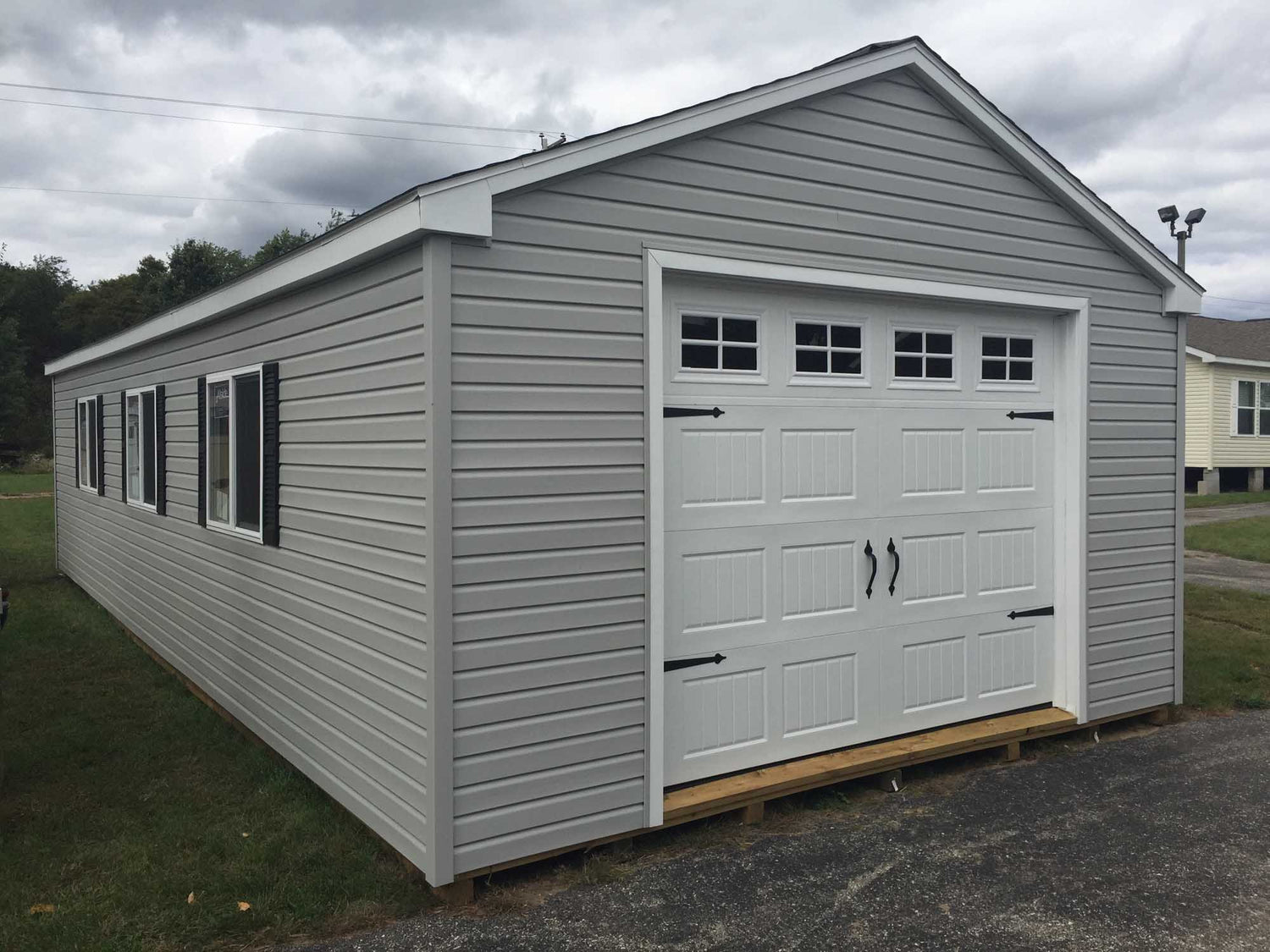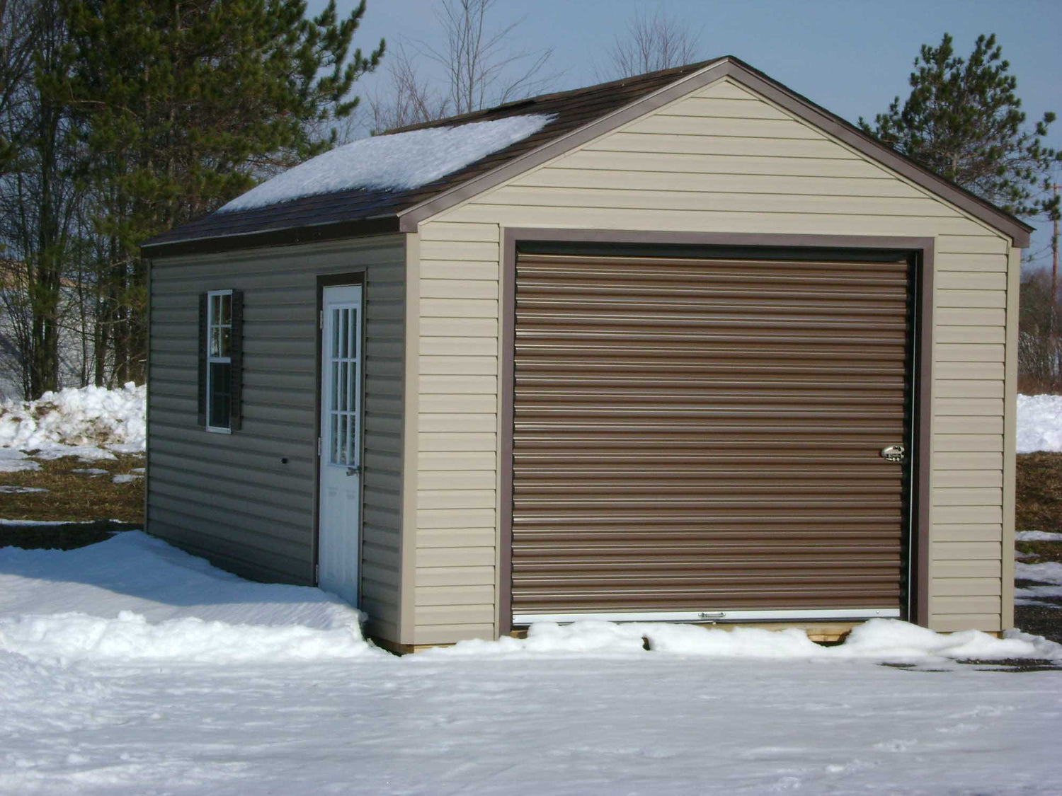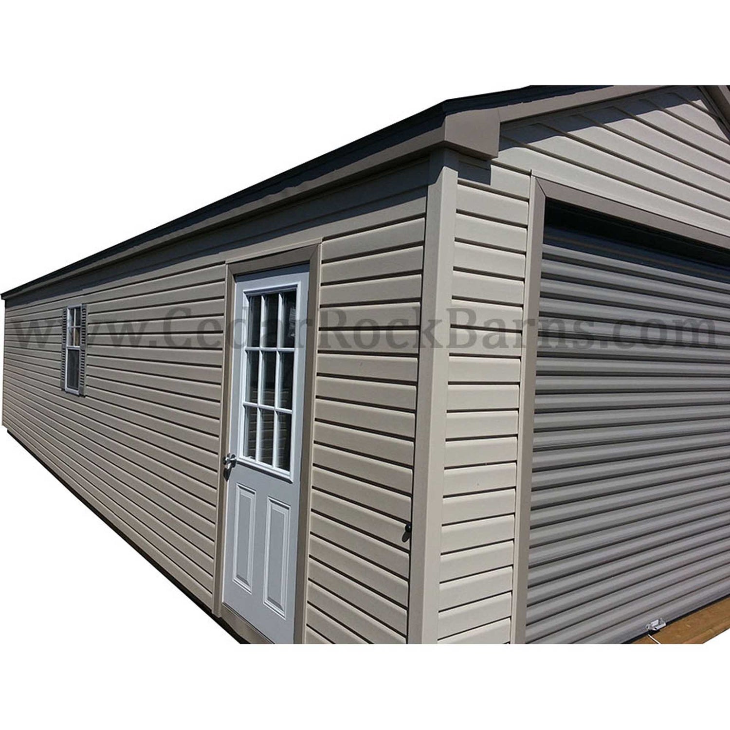 The Vinyl Garage Storage Building Comes Standard With An 8’ Steel TracRite Roll Up Door, 7’ 4” Sidewalls and 3/4" Treated Floors In Order To Hold A Vehicle Or Heavy Equipment. Larger Doors And Sectional Overhead Garage Doors Are Also Available On The Garage Storage Buildings. This Building Also Comes With Maintenance Free Lifetime Vinyl Siding (Your Choice Of Colors), And 3 Tab IKO 25 Year Shingles. These Portable Storage Buildings Are Delivered Fully Built And Available In Sizes Ranging From 12x16 And Up To 16x48.
