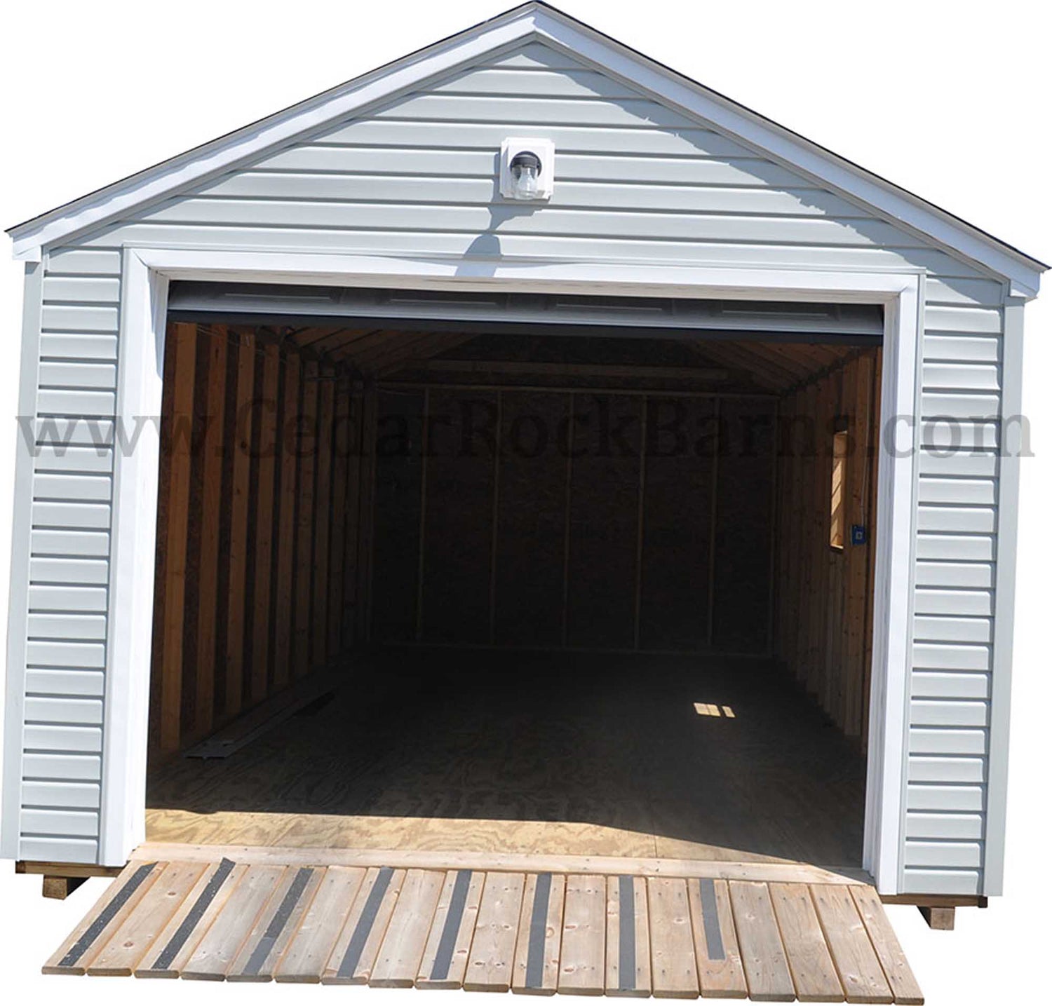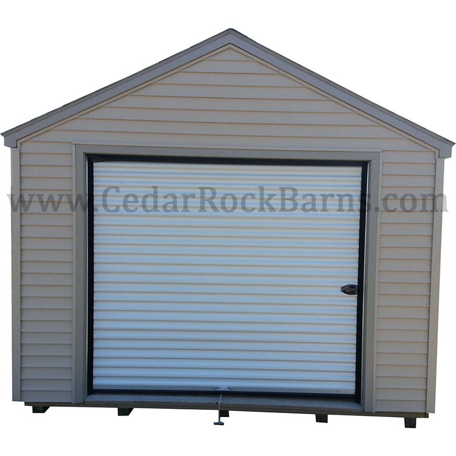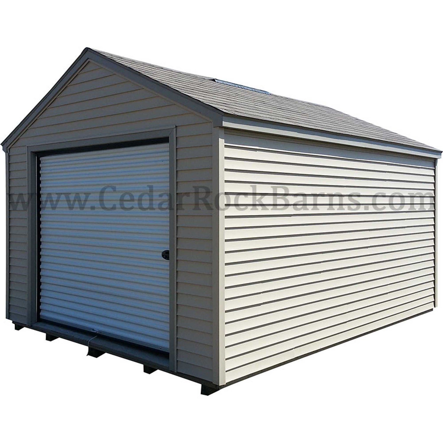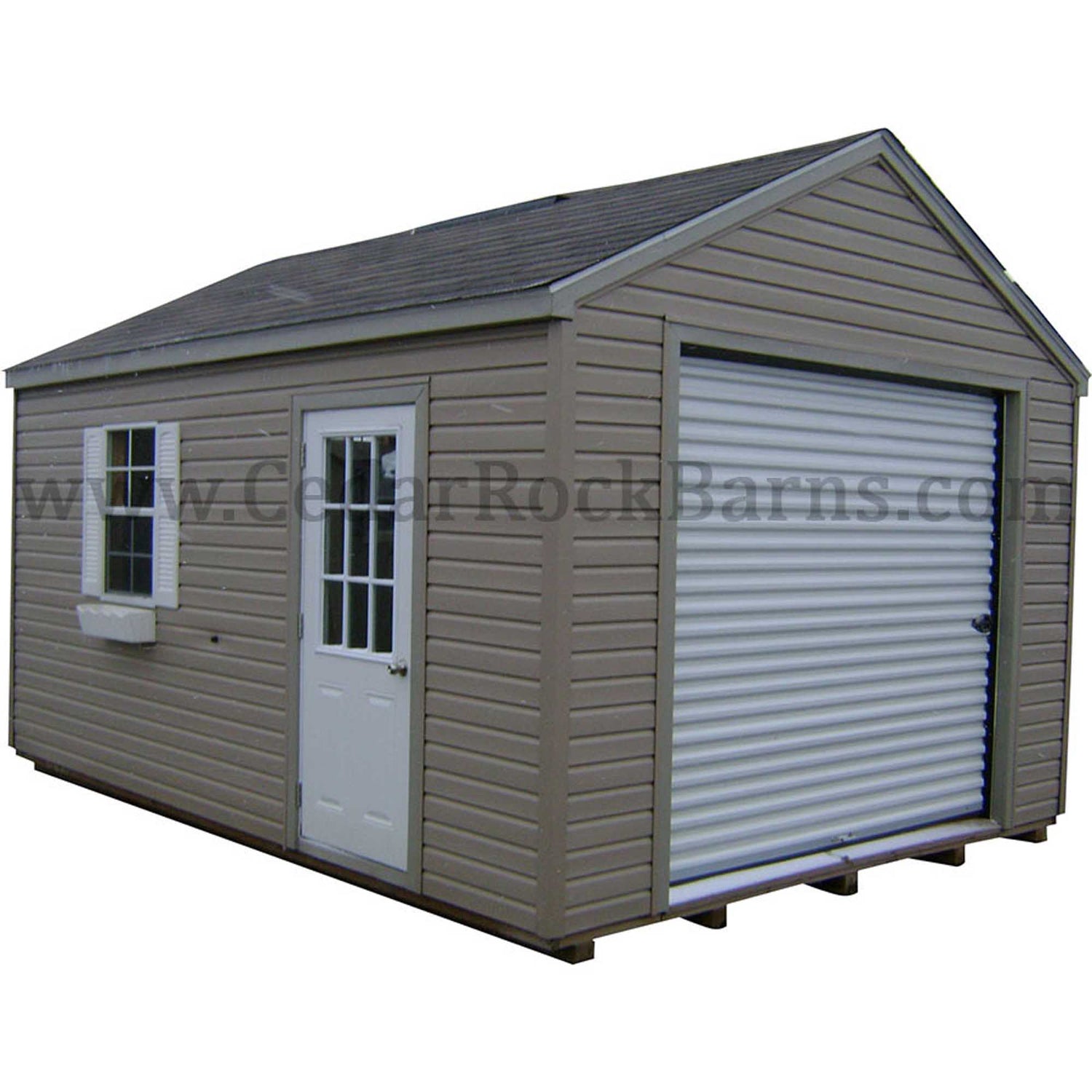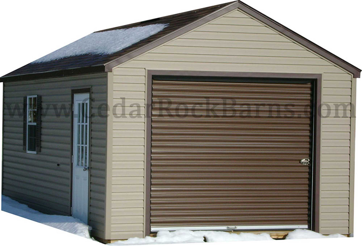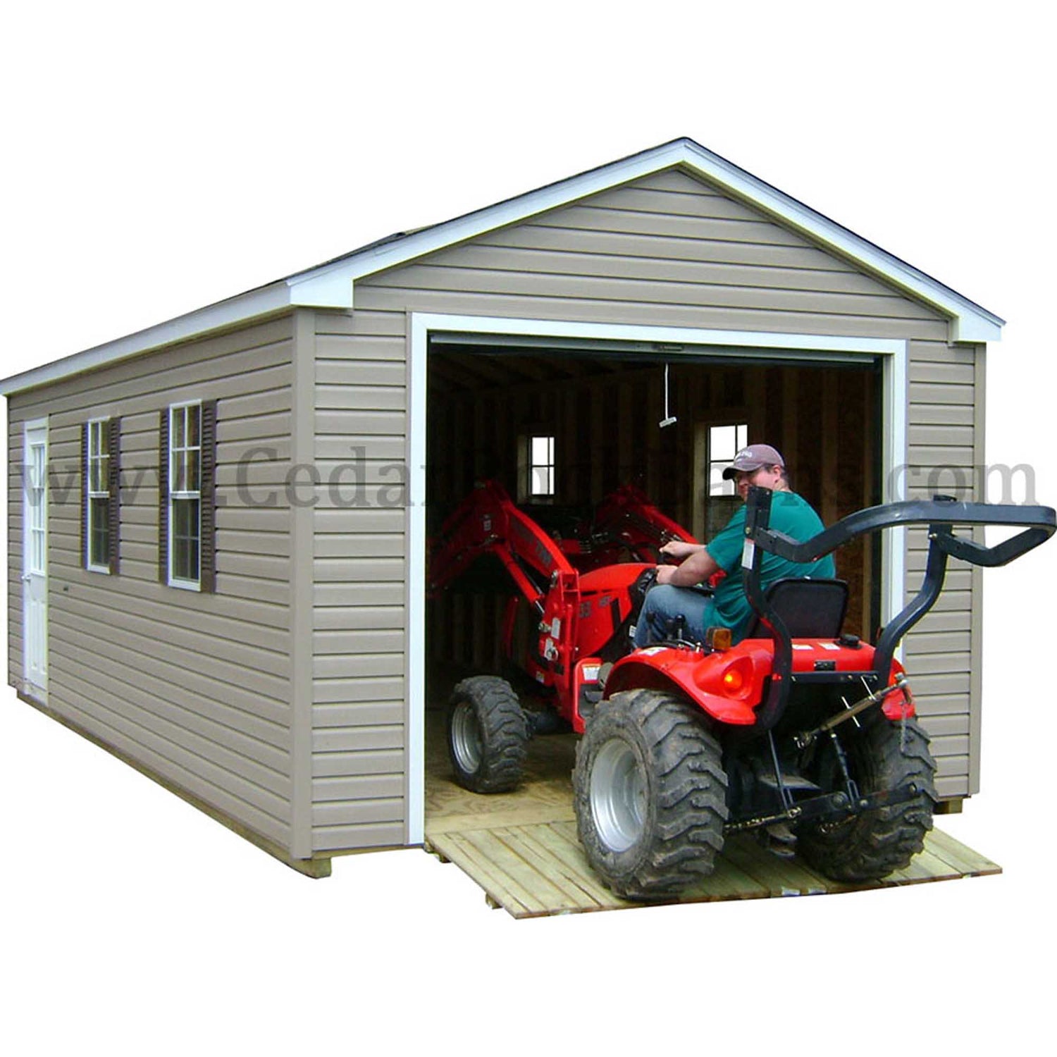 The Vinyl Garage Storage Building Comes Standard With An 8’ Steel TracRite Roll Up Door, 7’ 4” Sidewalls and 3/4" Treated Floors In Order To Hold A Vehicle Or Heavy Equipment. Larger Doors And Sectional Overhead Garage Doors Are Also Available On The Garage Storage Buildings. This Building Also Comes With Maintenance Free Lifetime Vinyl Siding (Your Choice Of Colors), And 3 Tab IKO 25 Year Shingles. These Portable Storage Buildings Are Delivered Fully Built And Available In Sizes Ranging From 12x16 And Up To 16x48.