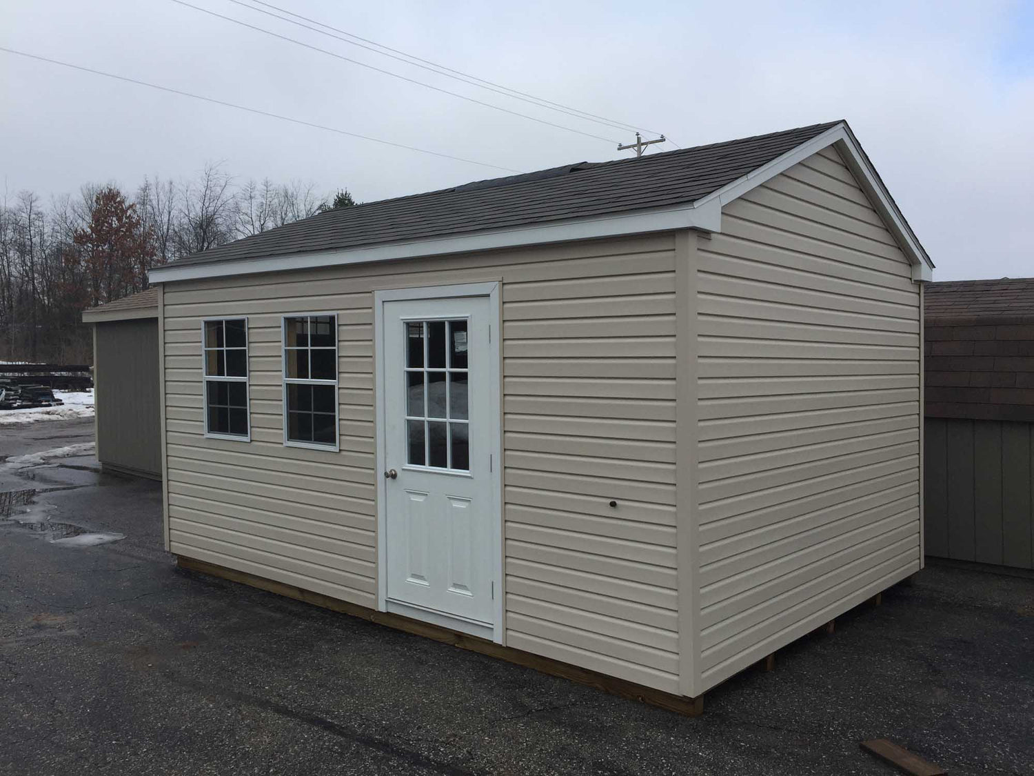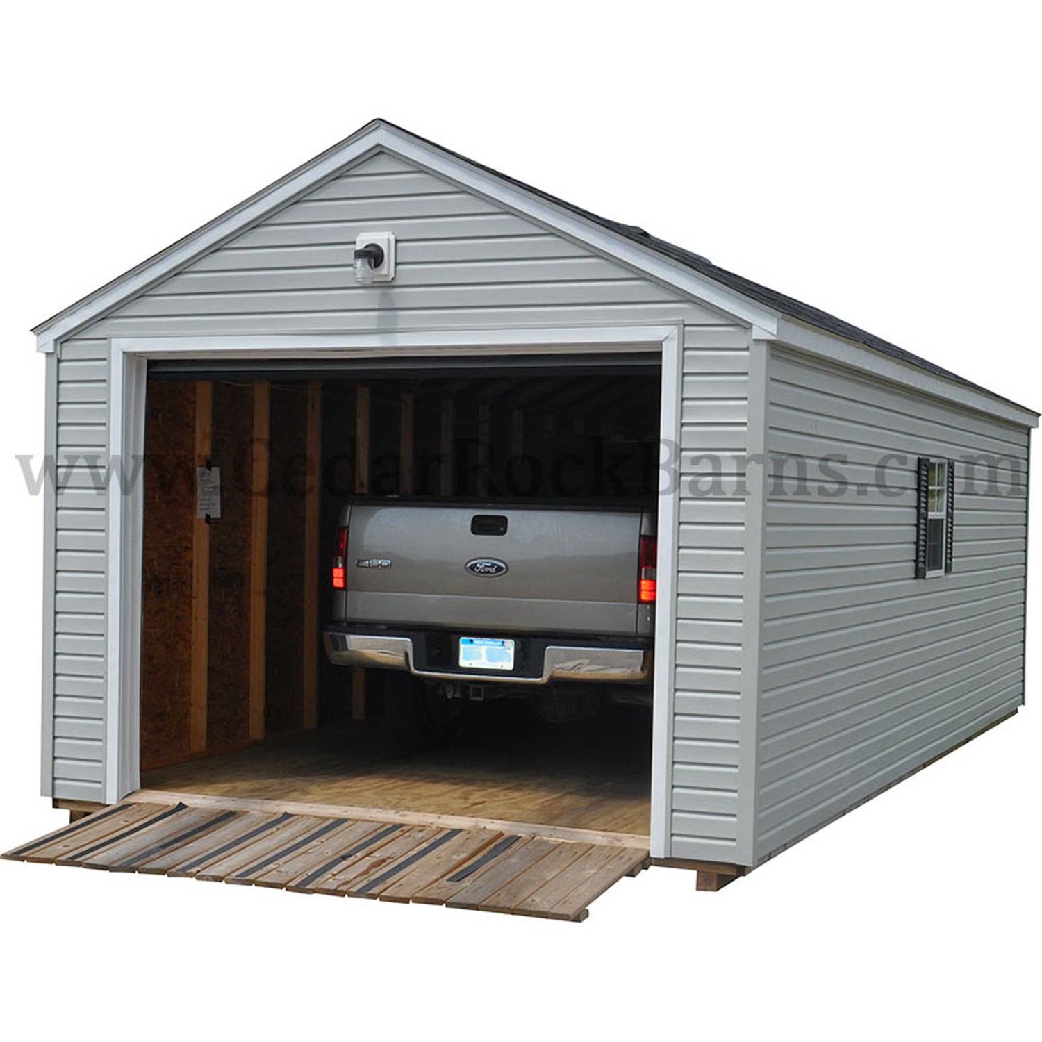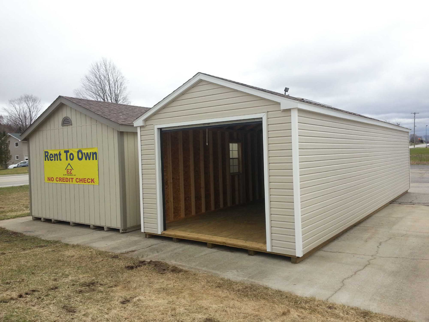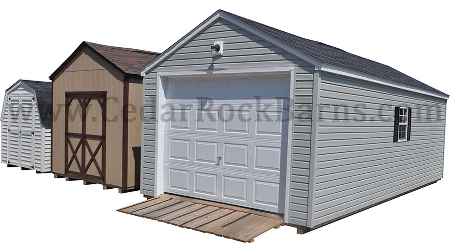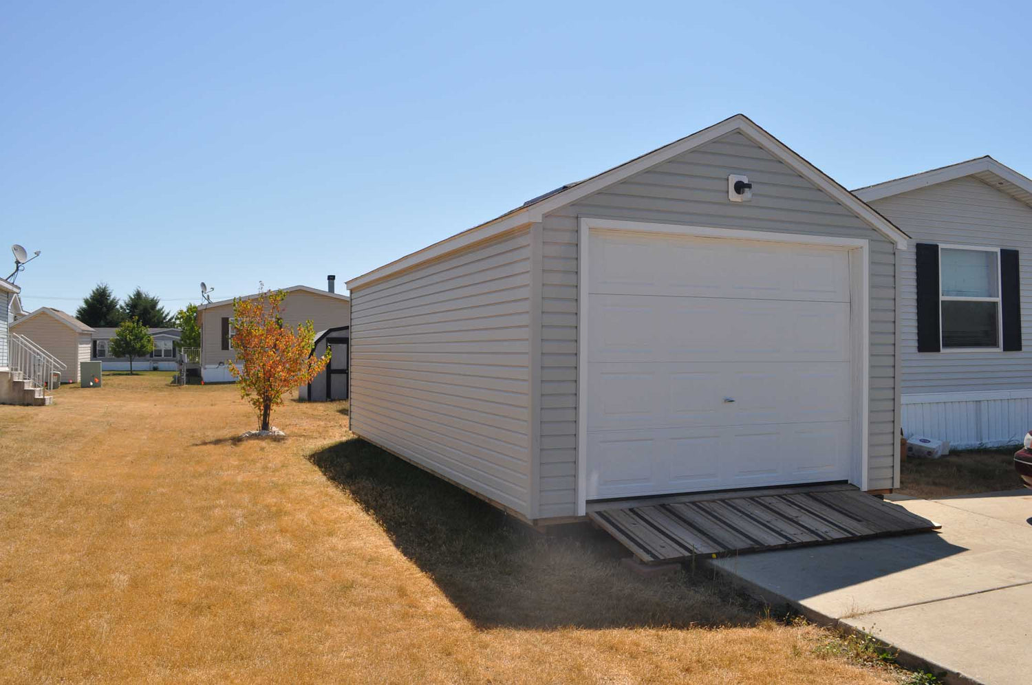 The Vinyl Garage Storage Building Comes Standard With An 8’ Steel TracRite Roll Up Door, 7’ 4” Sidewalls and 3/4" Treated Floors In Order To Hold A Vehicle Or Heavy Equipment. Larger Doors And Sectional Overhead Garage Doors Are Also Available On The Garage Storage Buildings. This Building Also Comes With Maintenance Free Lifetime Vinyl Siding (Your Choice Of Colors), And 3 Tab IKO 25 Year Shingles. These Portable Storage Buildings Are Delivered Fully Built And Available In Sizes Ranging From 12x16 And Up To 16x48.