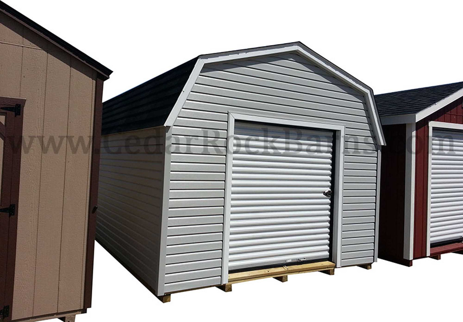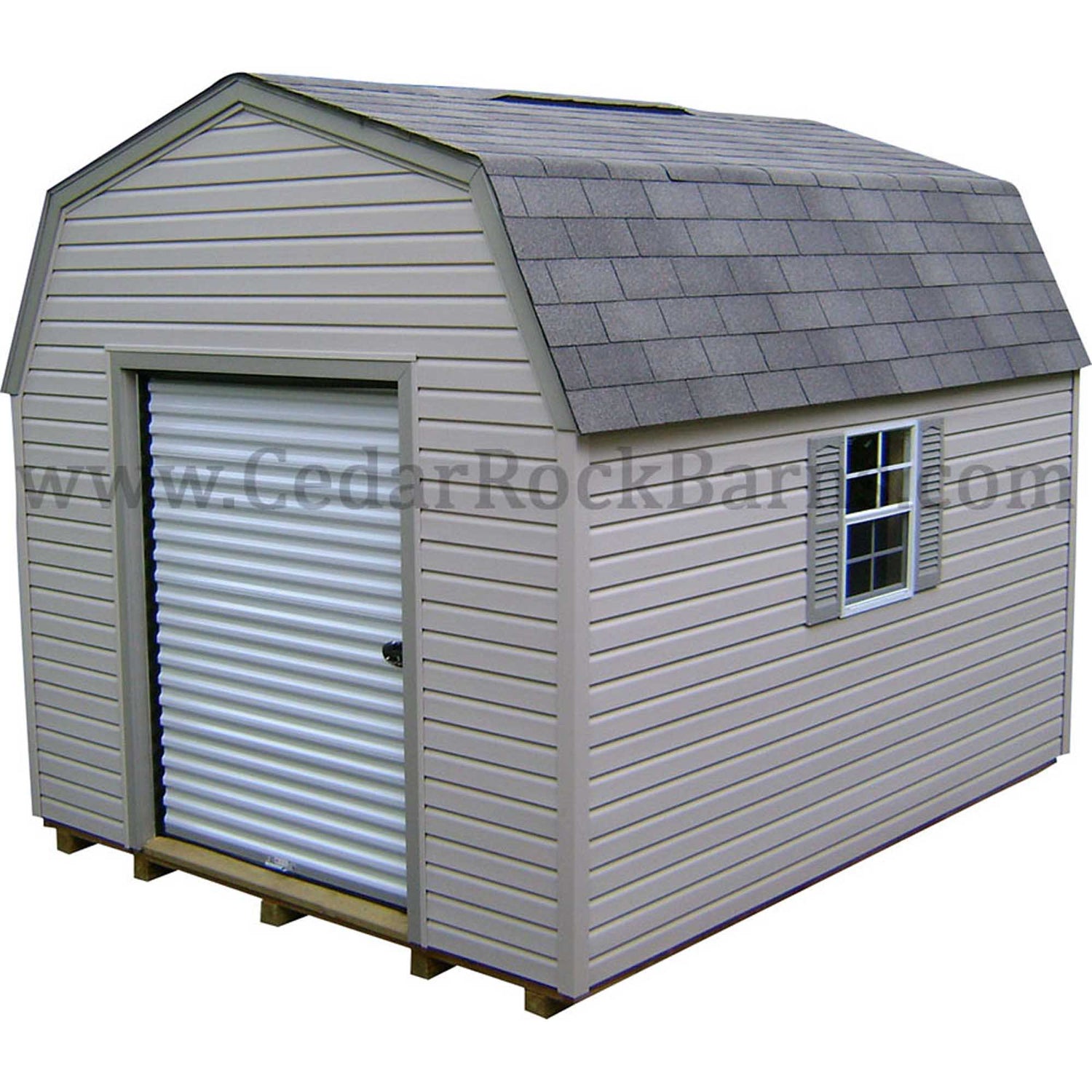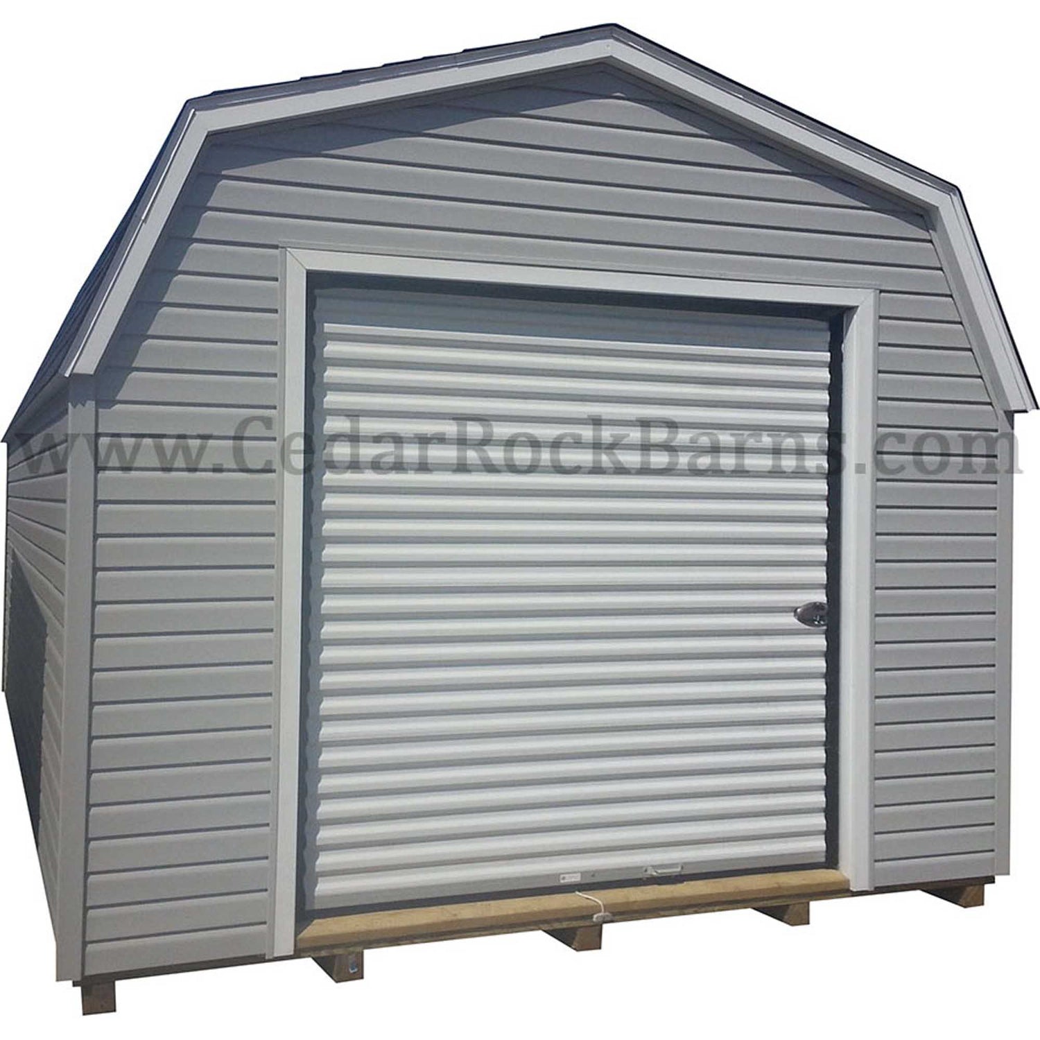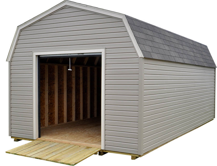 Vinyl Siding and A TracRite Metal Roll Up Door Come Standard With This Amish Built Outside Storage Building. Sheds For Sale In Sizes Ranging From 8x8 All The Way Up To 16x48. This Garden Storage Building Is Built To Last A Lifetime With Maintenance Free Vinyl Siding.