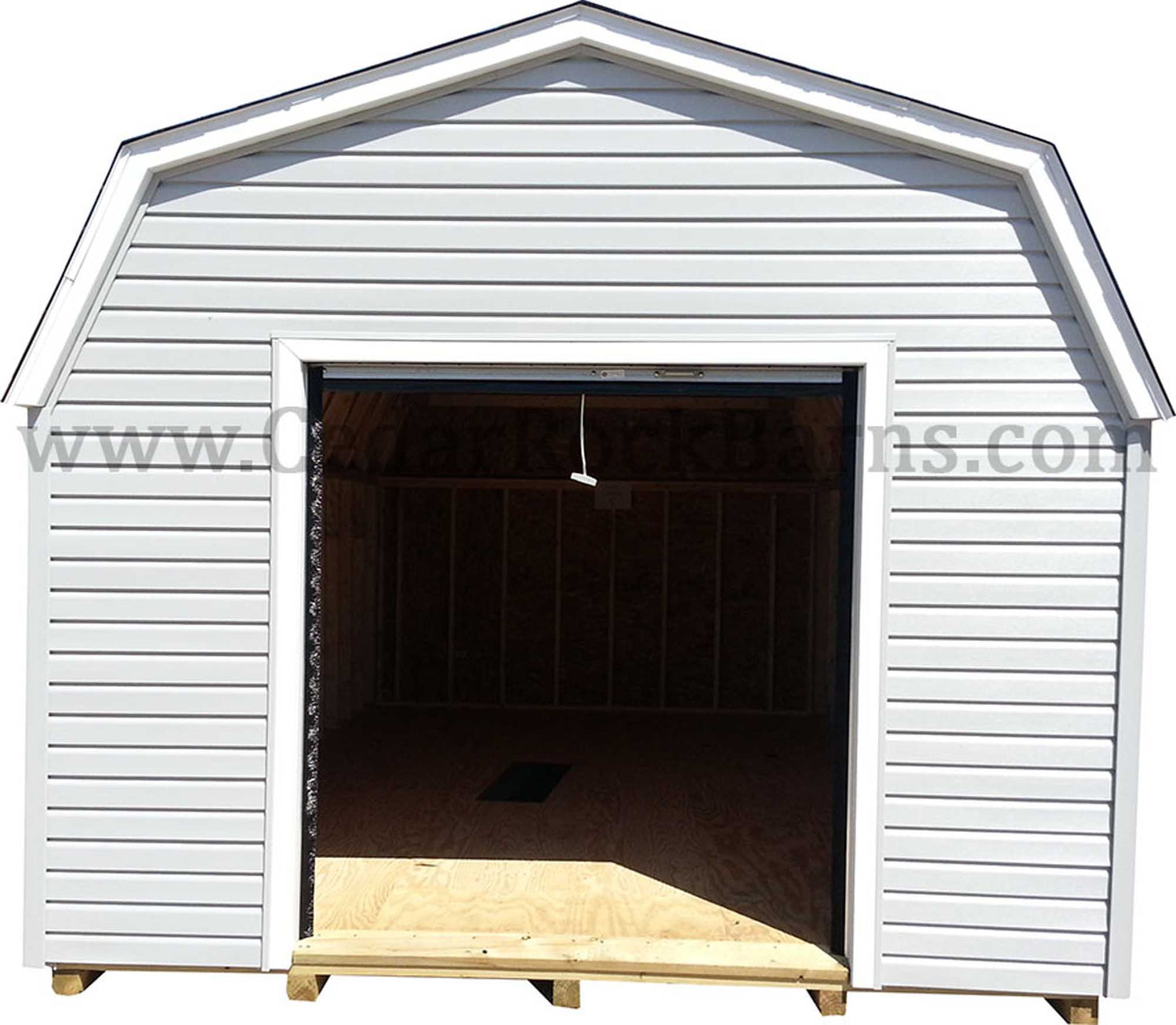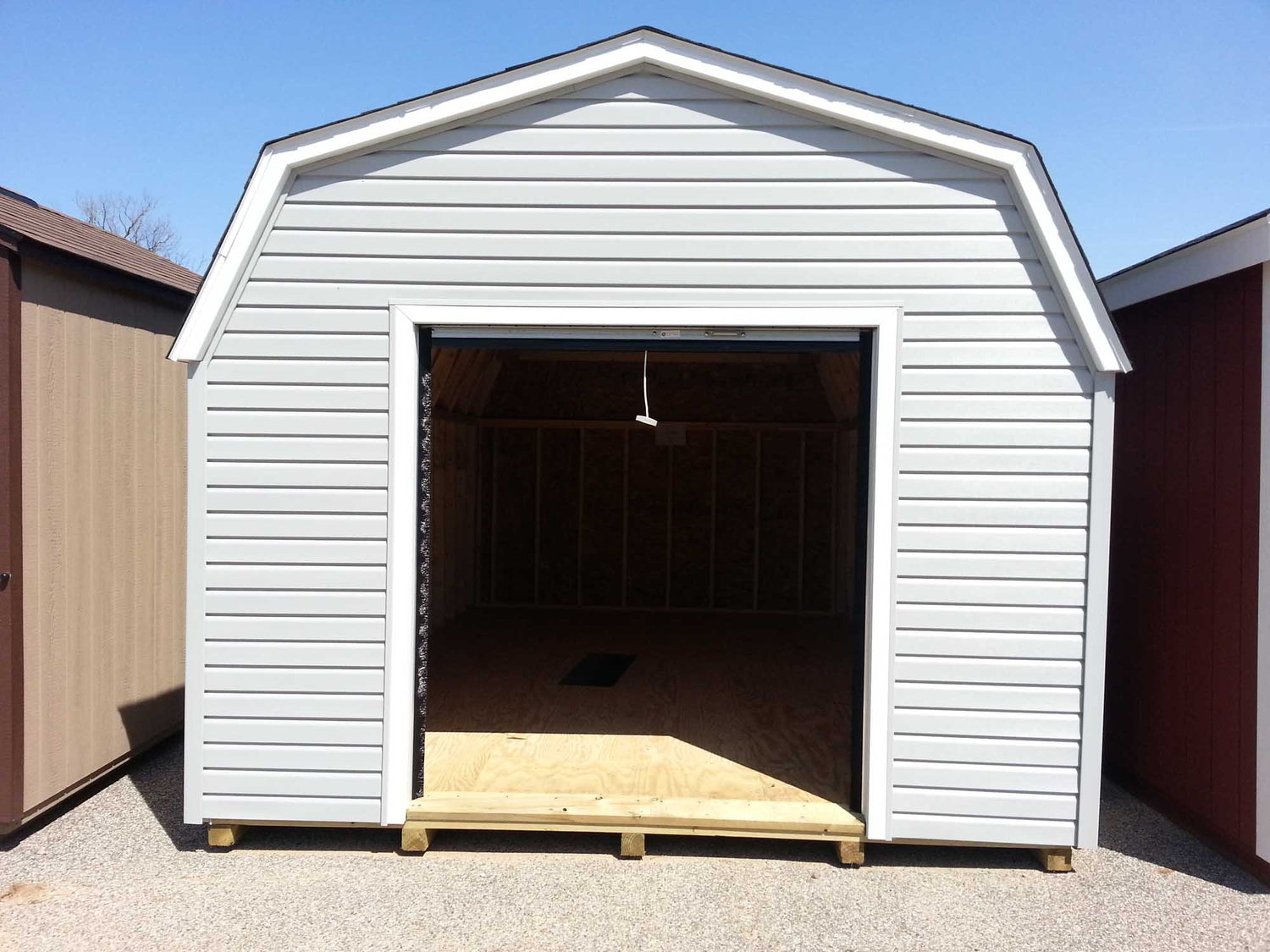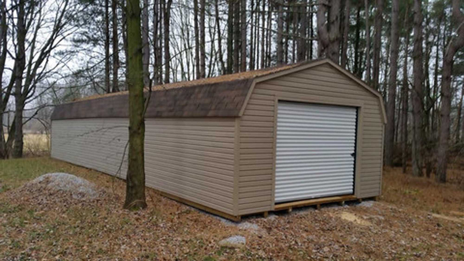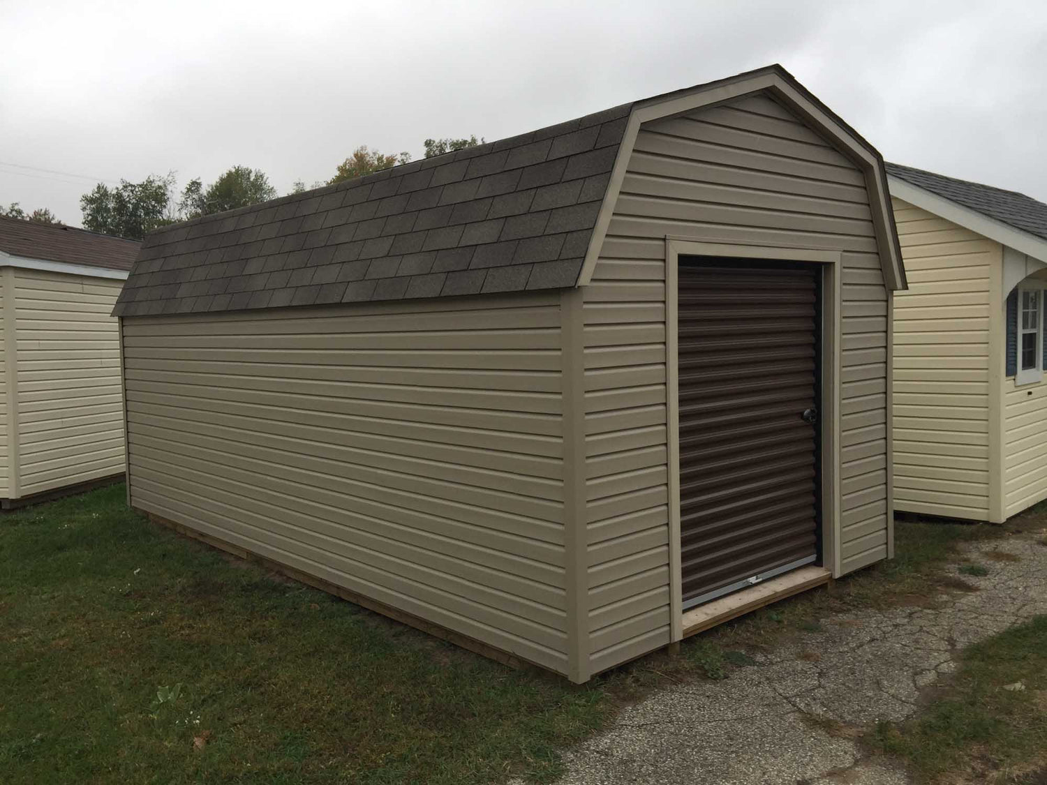 Vinyl Siding and A TracRite Metal Roll Up Door Come Standard With This Amish Built Outside Storage Building. Sheds For Sale In Sizes Ranging From 8x8 All The Way Up To 16x48. This Garden Storage Building Is Built To Last A Lifetime With Maintenance Free Vinyl Siding.